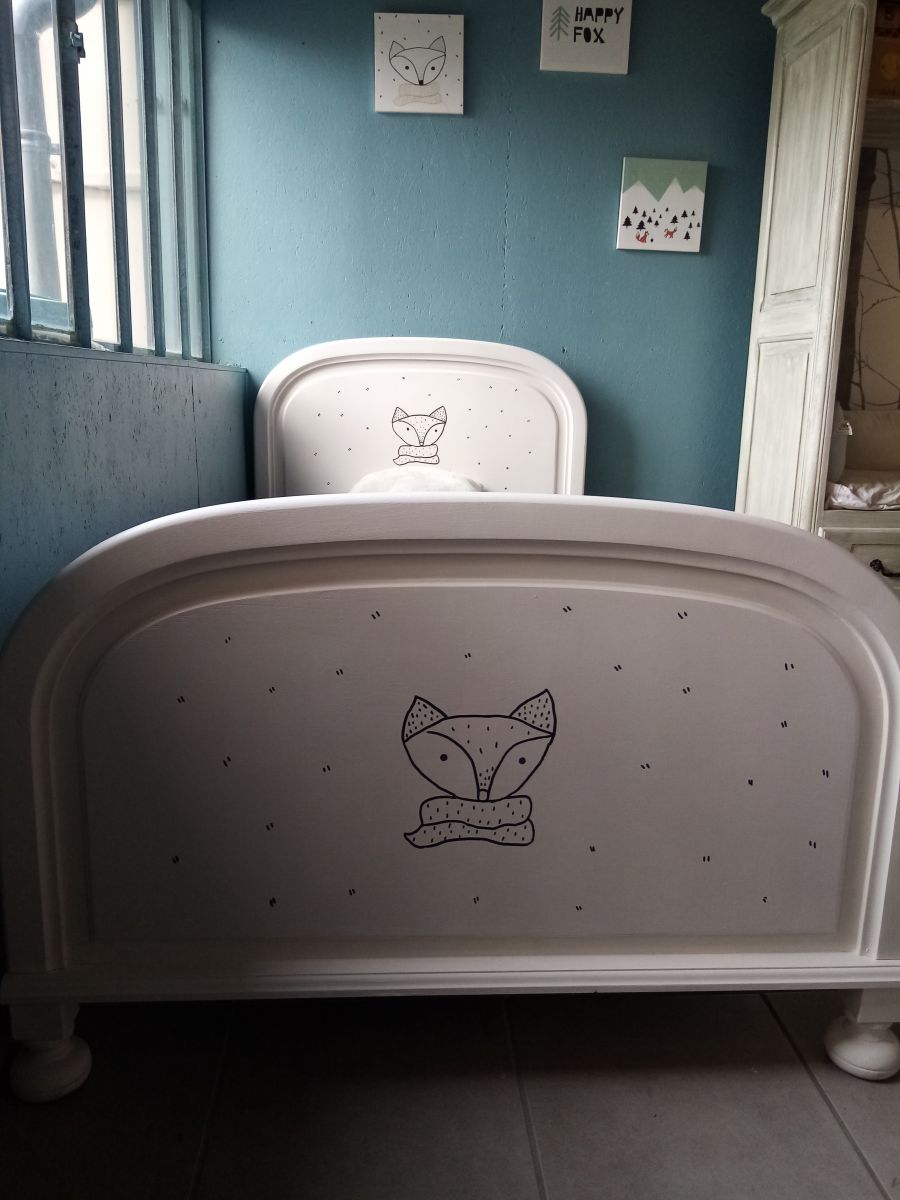 Bois lit enfant de taille standard ne comprenant ni le sommier, ni le matelas. Le lit a été peint en blanc et des renards noirs ont été dessinés sur les 2 panneaux. Dimensions: L:100x l200