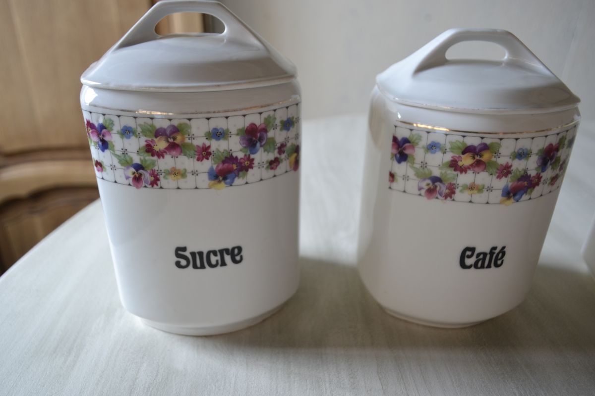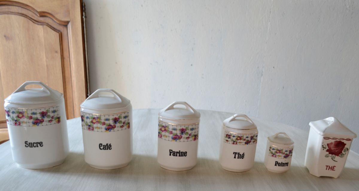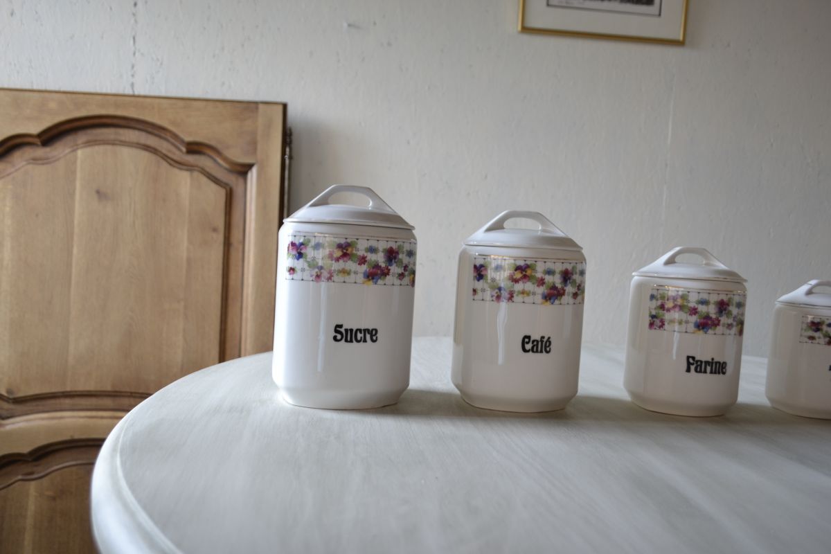 lot de 5 pots à épice de la même collection à motif floral en bon état. Seules les dorures des couvercles ont été effacées avec le temps. Un pot Thé d’une autre collection est également inclus dans le lot.