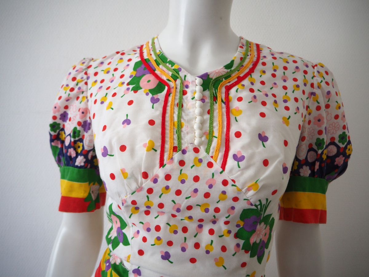 Jolie petite robe bucolique blanche avec ses motifs à pois et fleuris multicolores datant des années 1960.
