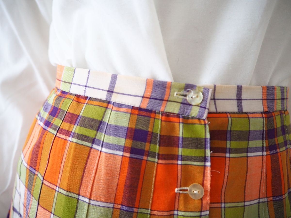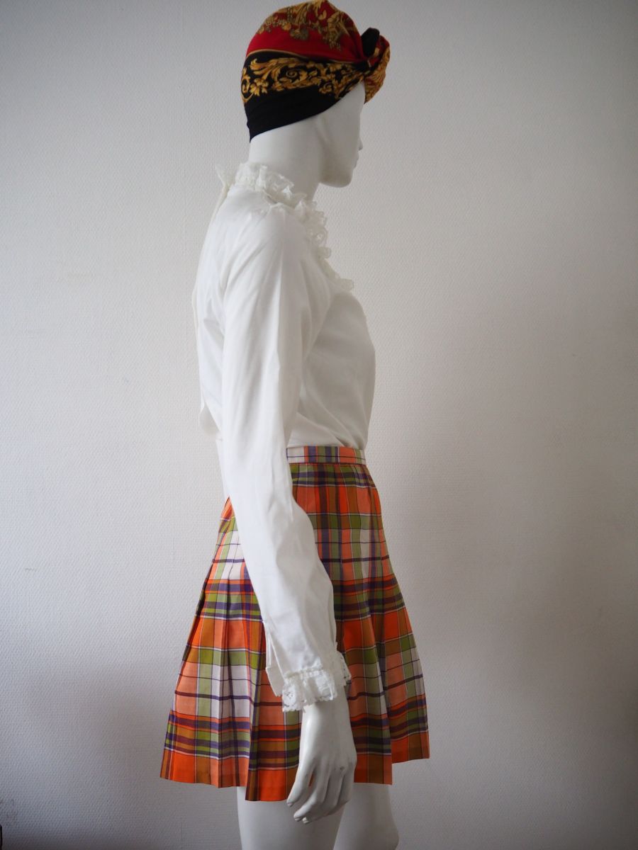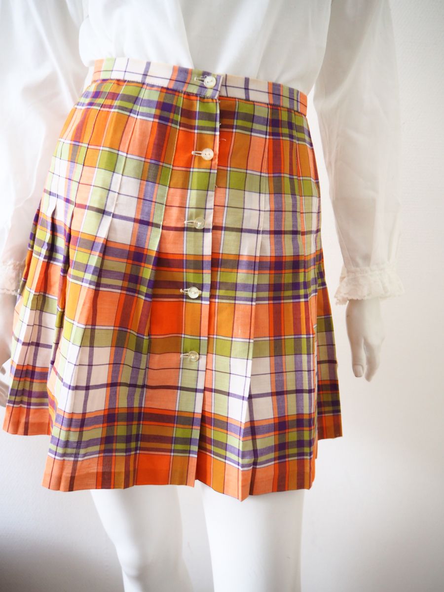 Jolie mini-jupe plissée aux motifs tartan oranges/verts/blancs/mauves datant des années 1970.