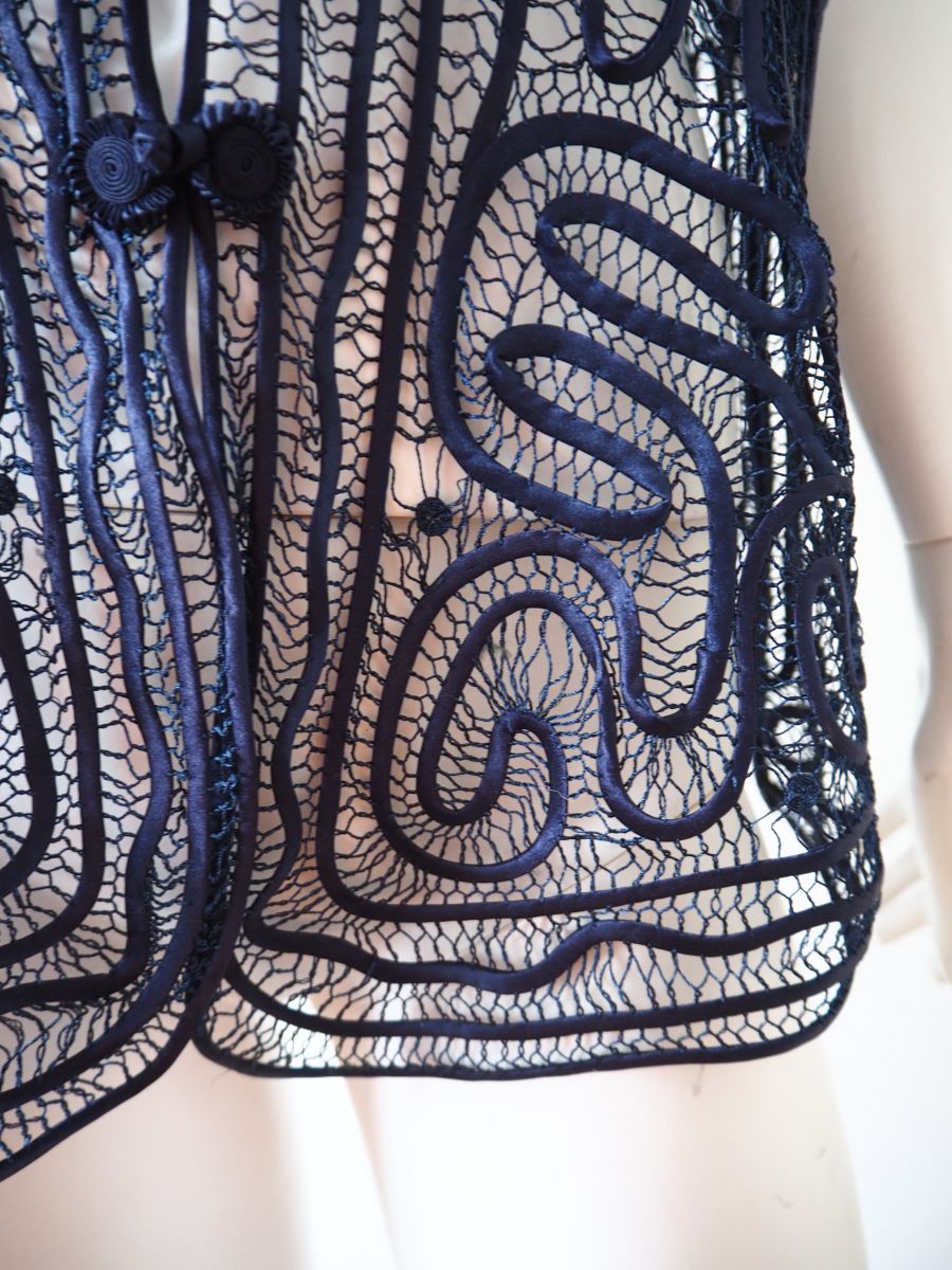 Superbe gilet long sans manche en macramé de couleur bleu marine datant des années 1970.