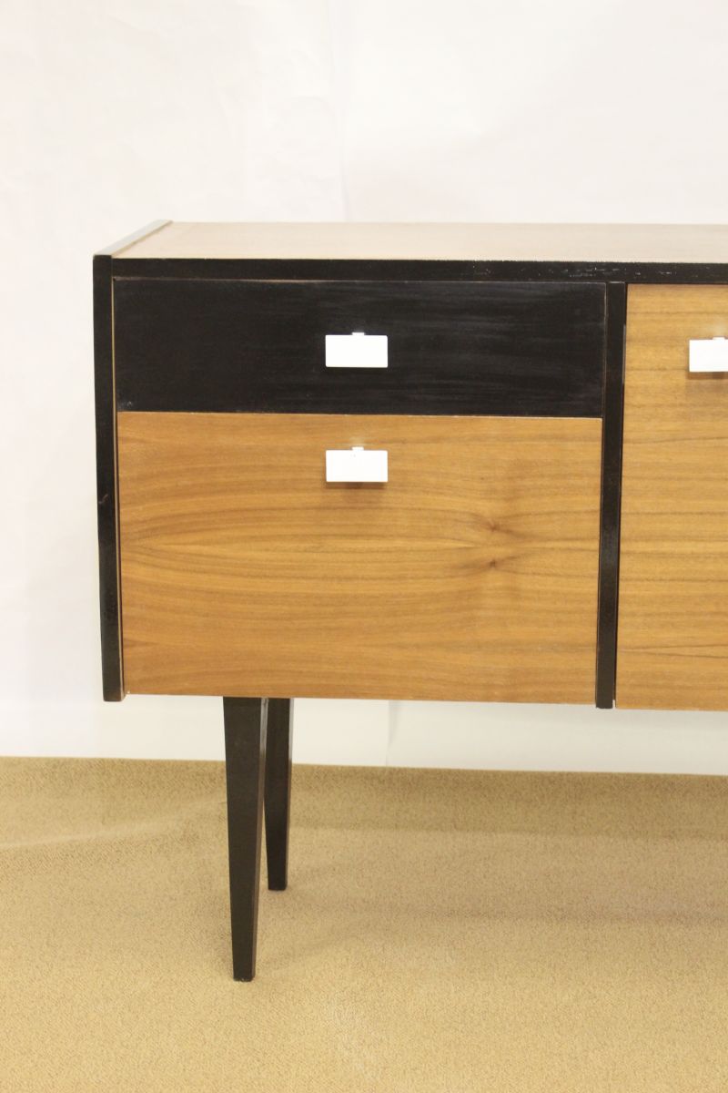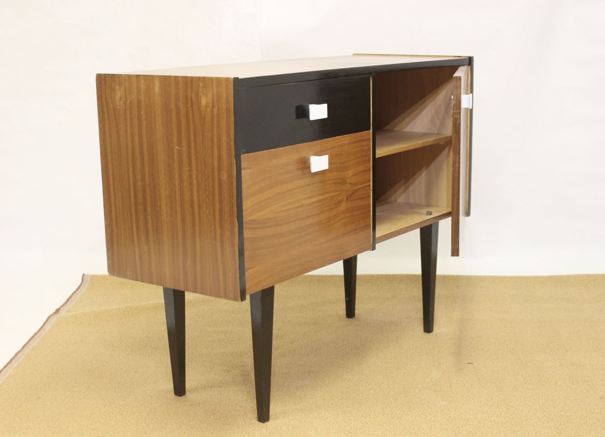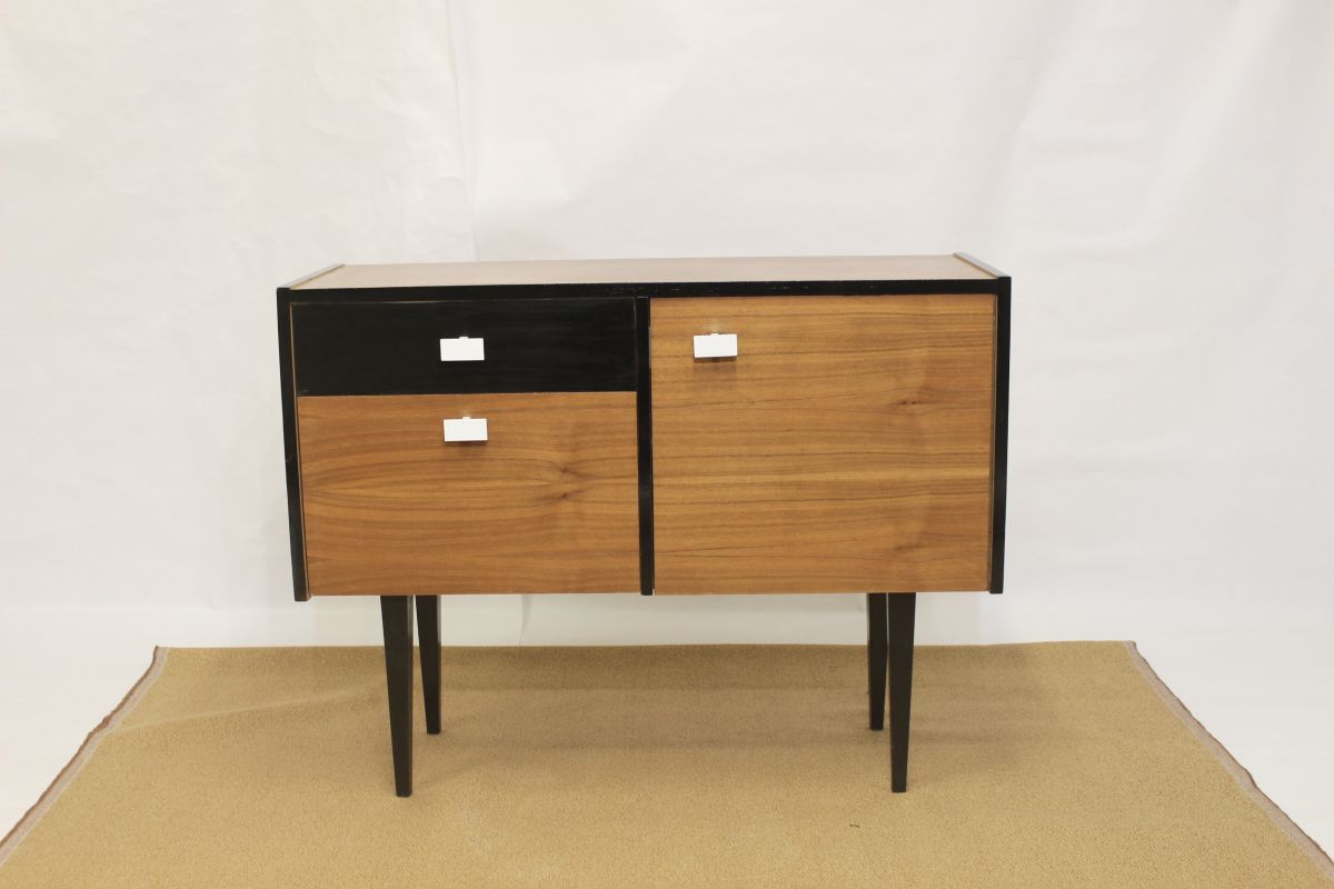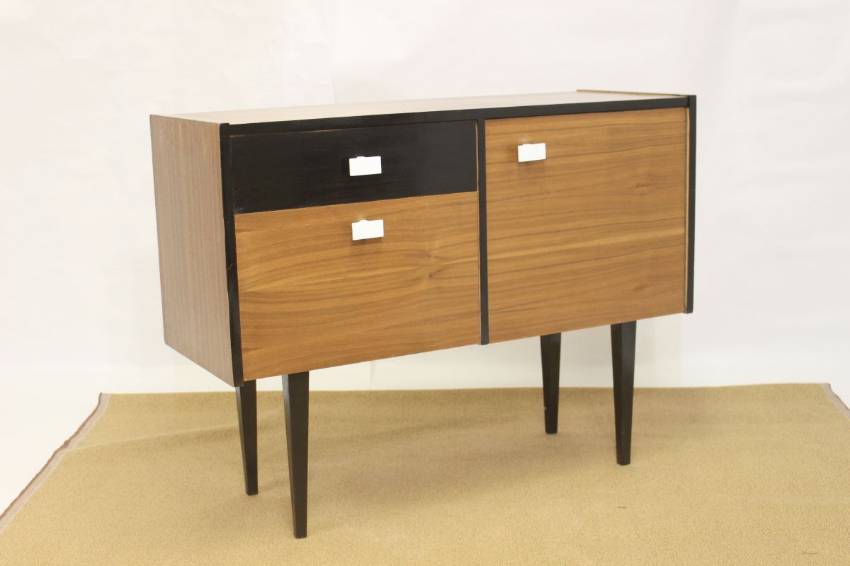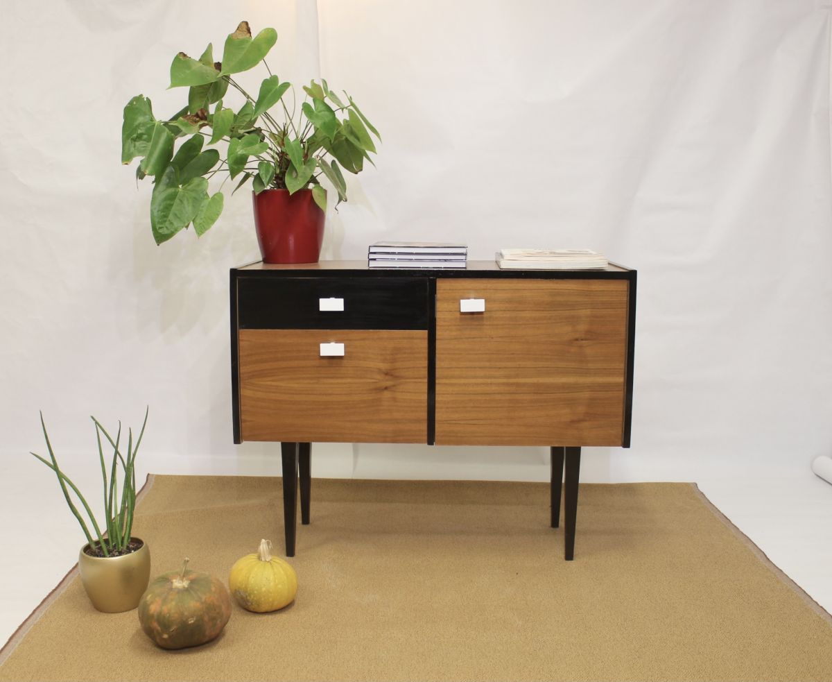 Petite enfilade années 60 avec deux rangements et un tiroir. Quelques rénovations ont été nécessaire pour lui donner une jolie personnalité. Elle est en bonne état. Le piétement en bois peint en noir a été restauré. Petite enfilade qui peut s’installer partout dans votre maison. L’enfilade a été nettoyé est cirée. Le meuble est sain, les pieds sont démontables. Dimensions: largeur 86cm, profondeur 33cm, hauteur 66cm, poids 16 kg.