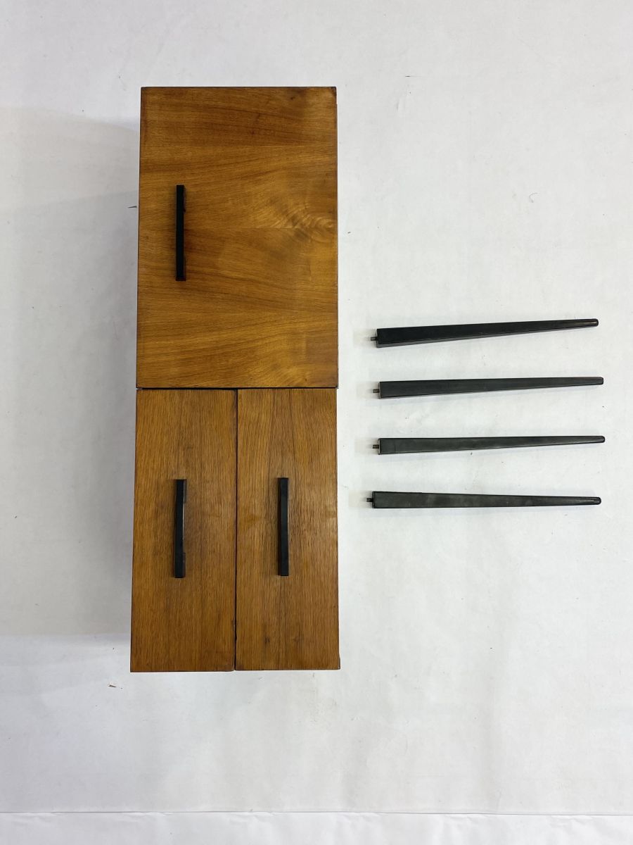 Petite enfilade années 60 avec une porte et ses deux tiroirs. Quelques rénovations ont été nécessaire pour lui donner une jolie personnalité. Elle est en bonne état. Le piétement en bois peint en noir est d’origine. Petite enfilade qui peut s’installer partout dans votre maison. On note un vernis avec des traces d’usages sur le haut. L’enfilade a été nettoyé est ciré. Le meuble est sain, les pieds sont démontables.
