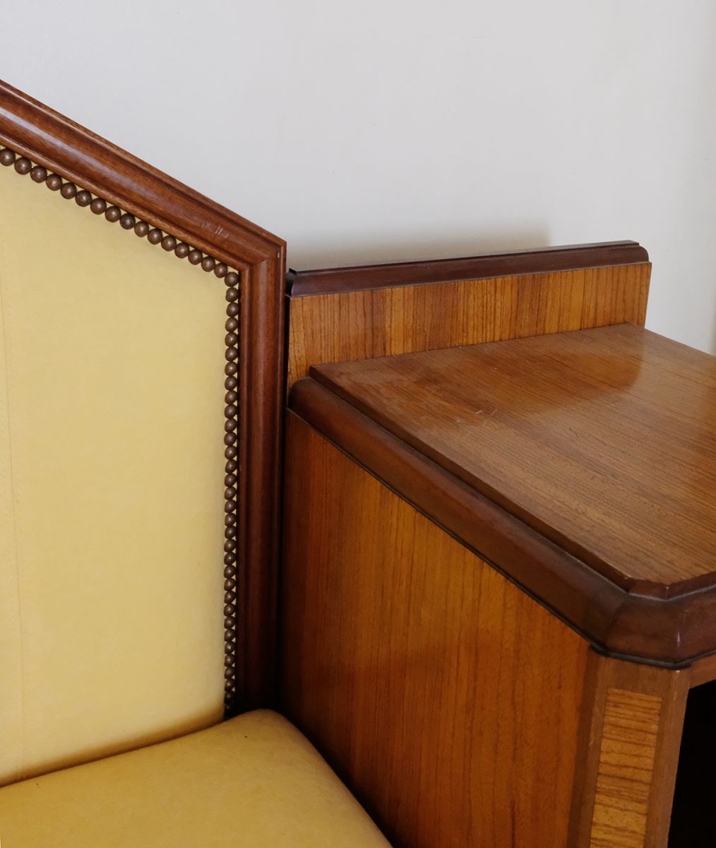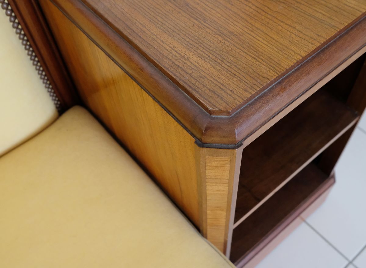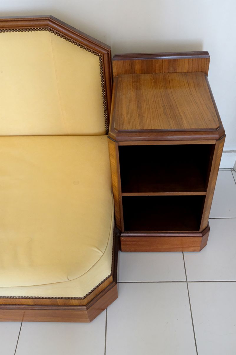 Authentique canapé année 30, bois massif (acajou et autres essences) avec marqueterie. Longueur d'assise : 140 cm, profondeur d'assise : 67 cm, hauteur d'assise : 35 cm. Niches latérales et dossier amovibles pour le transport. Affaissement de l'assise en partie centrale, rembourrage à prévoir éventuellement. À retirer sur place (Paris/Porte des Lilas)
