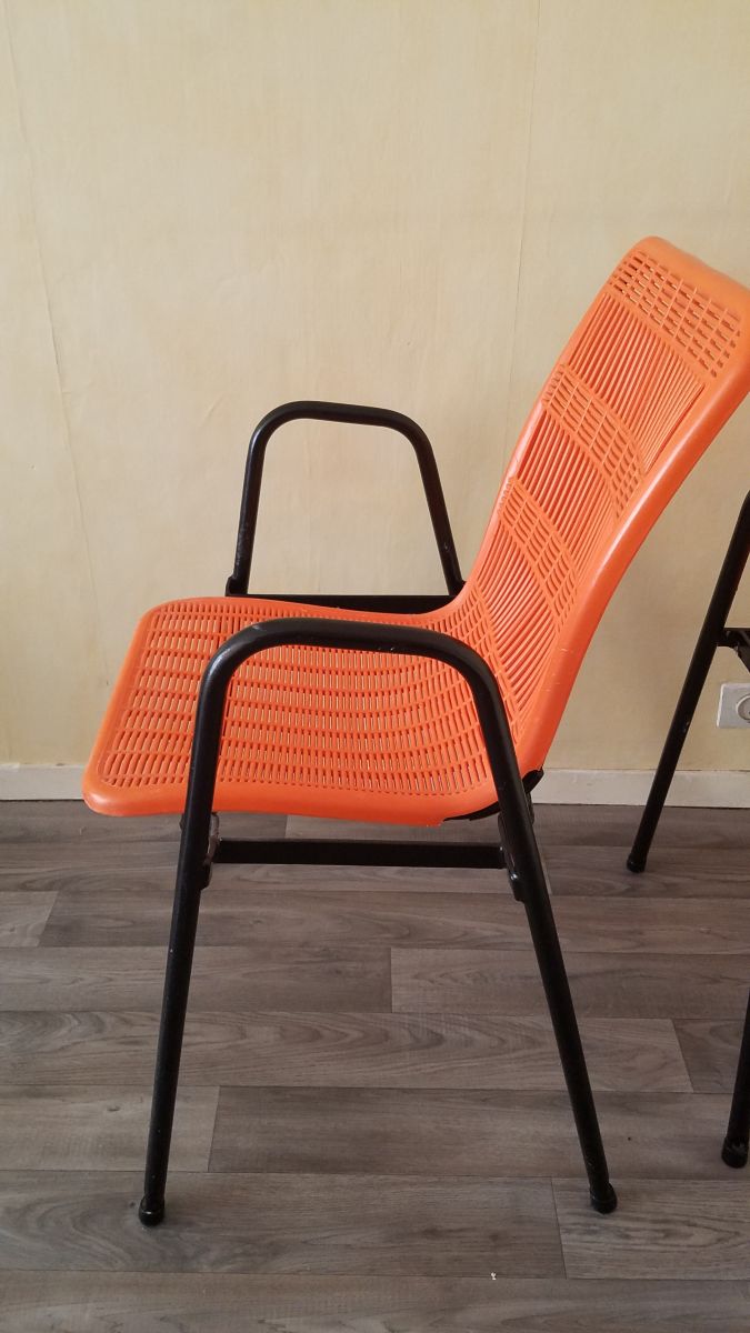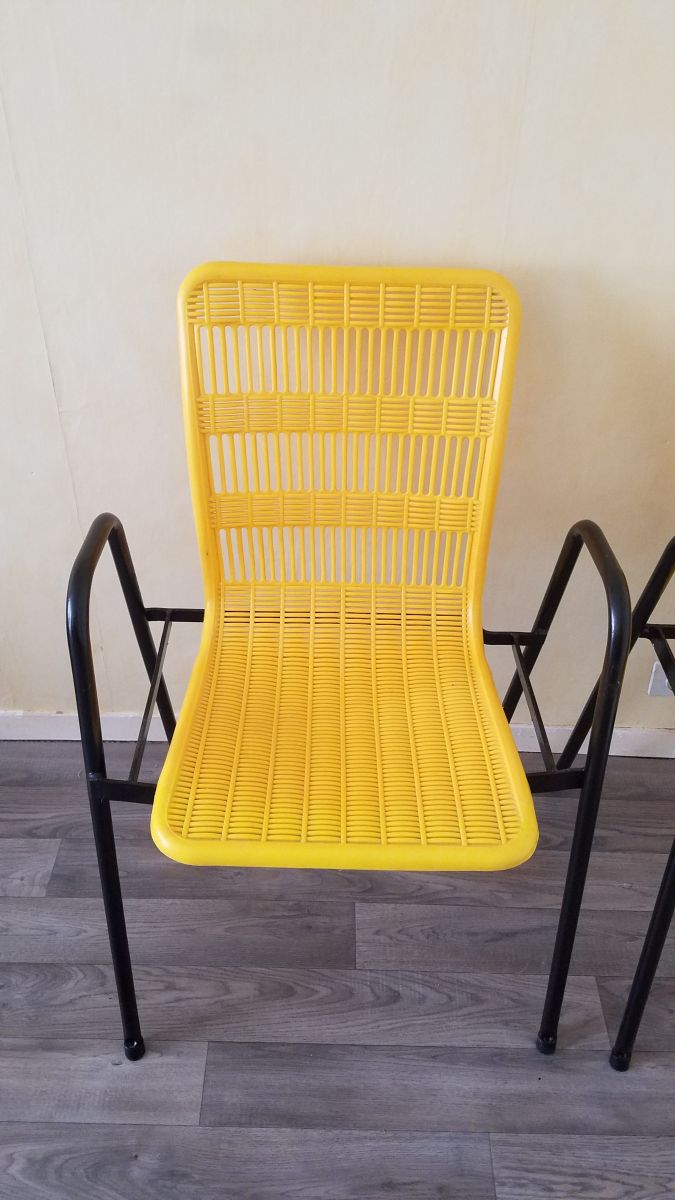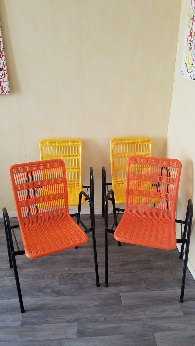 Lot de 4 magnifiques chaises de terrasse de café des années de la fin des années 60's, aux couleurs très acidulées!