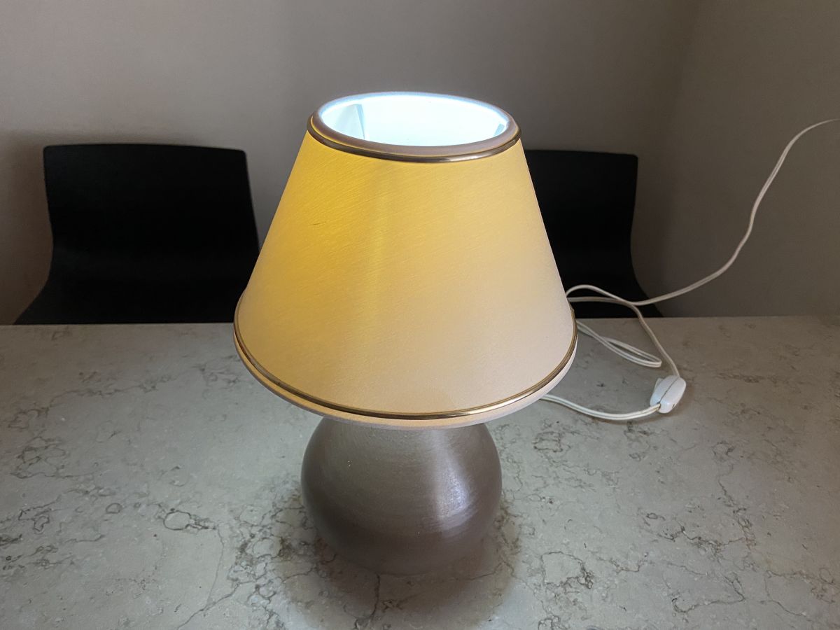 Lampe à poser des années 70 en céramique marron, abat-jour changé car l’original était trop abîmé, hauteur 31cm, diamètre 13cm, diamètre abat-jour 18cm, bon état.