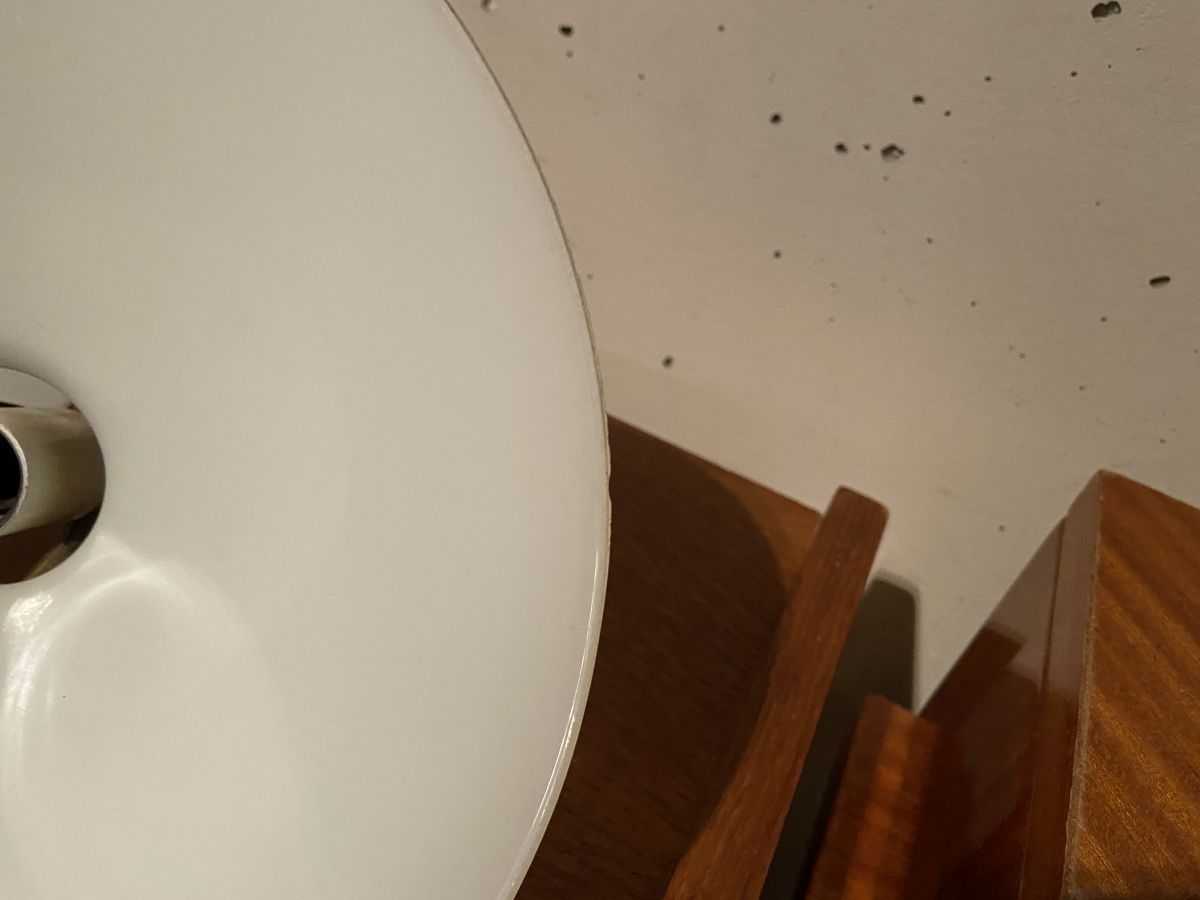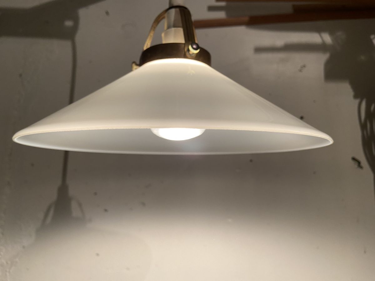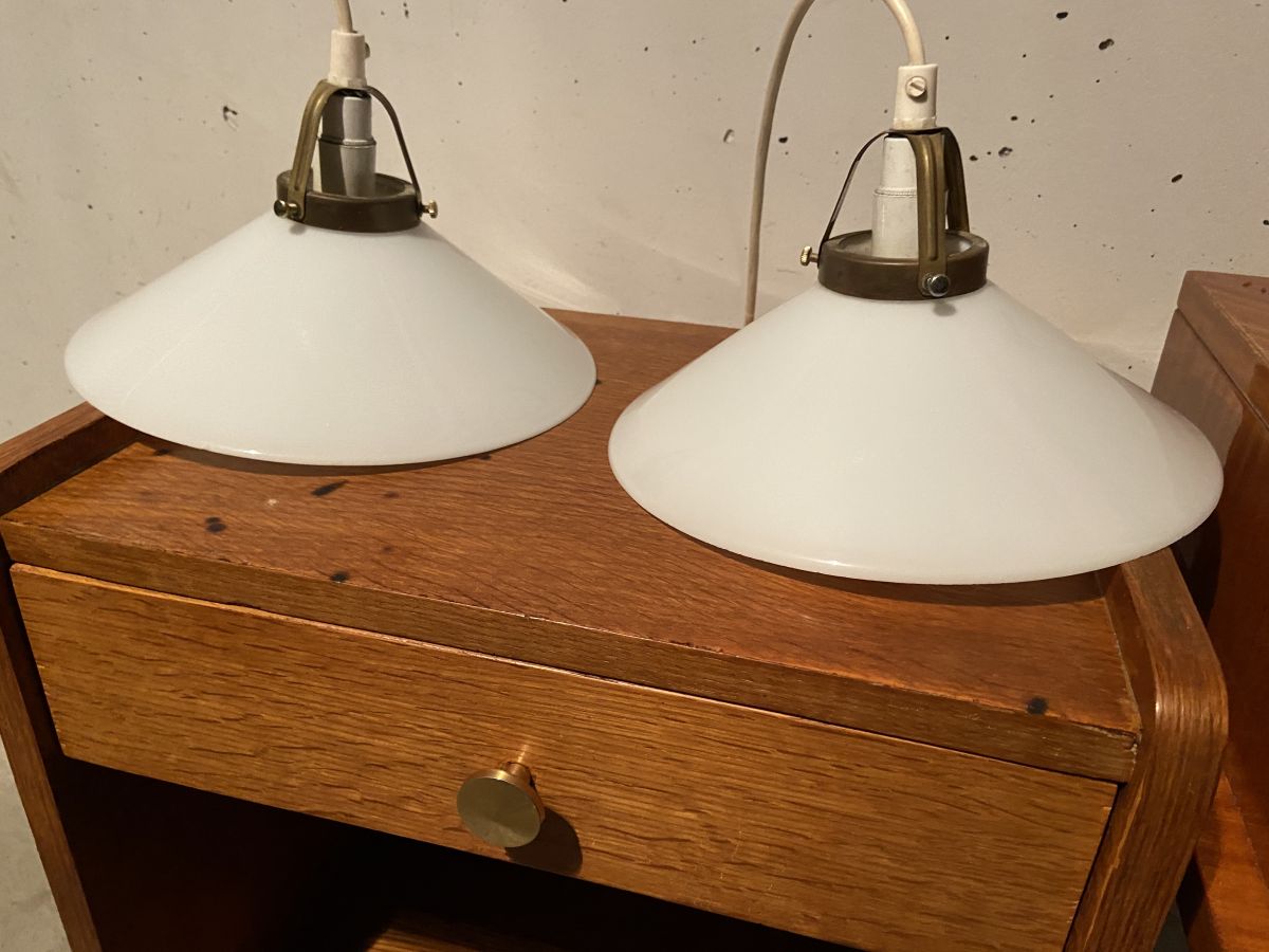 Paire de suspensions en opaline des années 60, 2 minuscules éclats sur le bord, quasiment invisibles (voir photos), montant de douille en laiton, fonctionne parfaitement (ampoule vissée type E14), diamètre 25cm, hauteur avec la douille 13cm, bon état général.