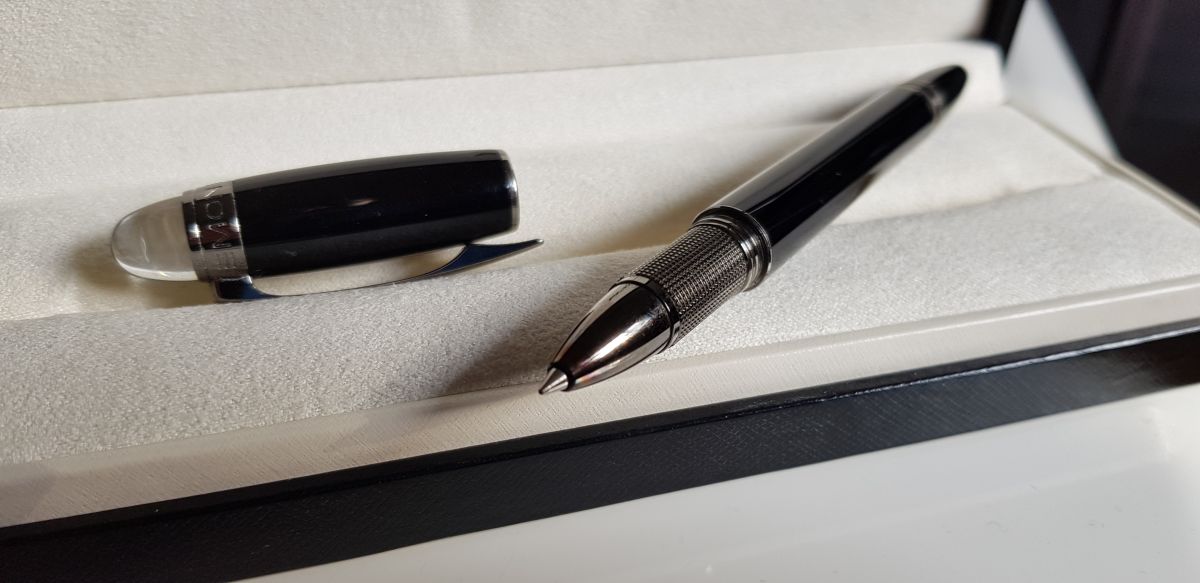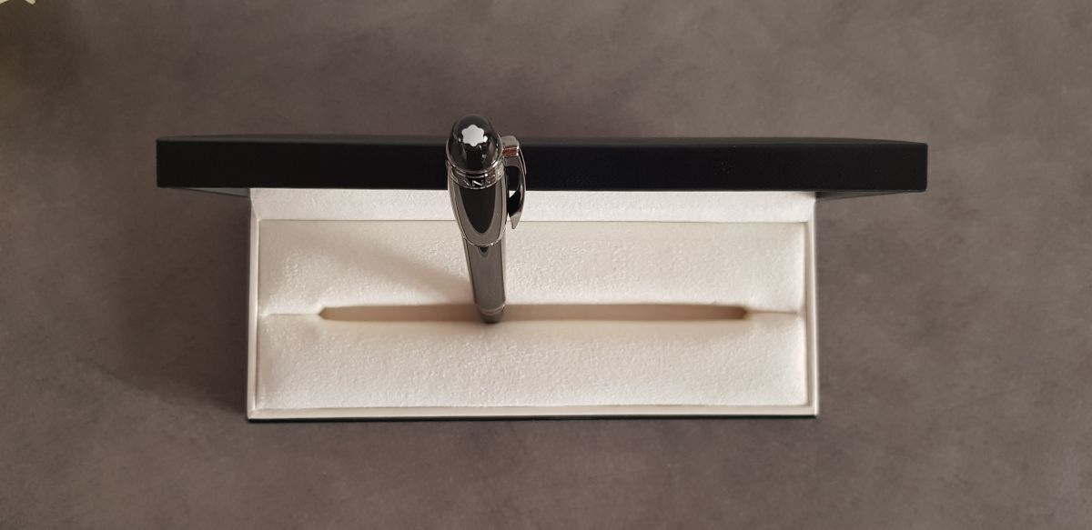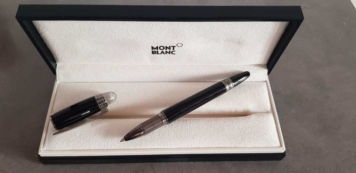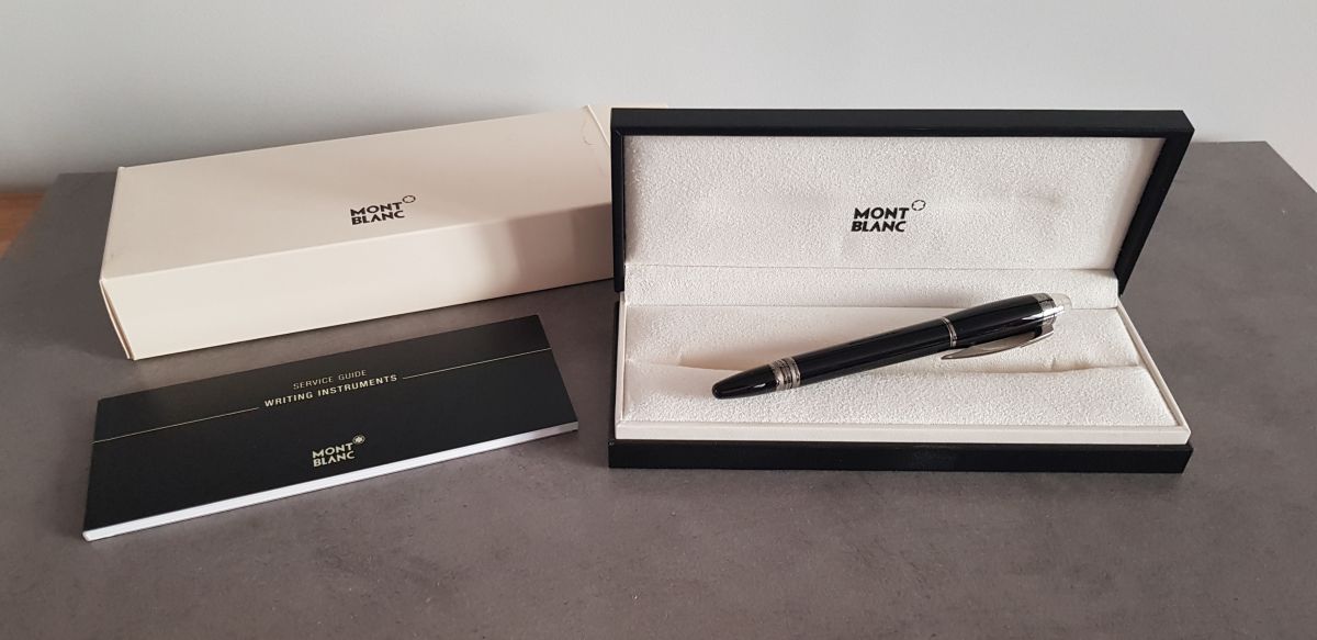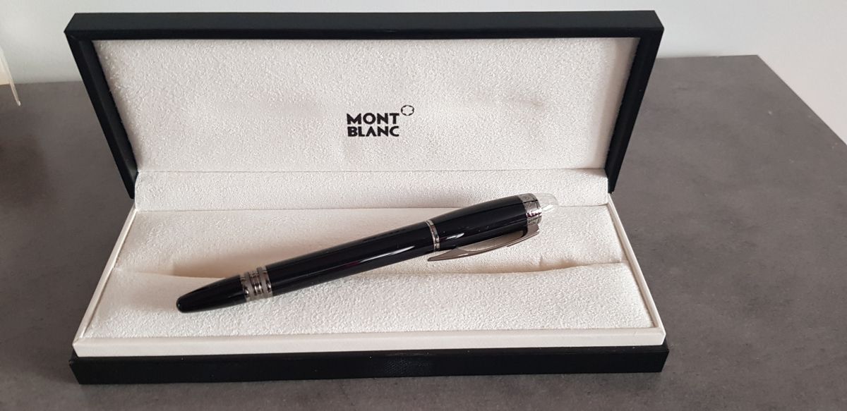 Stylo Montblanc Starwalker en bon état. Très peu utilisé. Cartouche changée (neuve). Complet : stylo, son écrin et la boite contenant l'écrin (le tout siglé Montblanc)