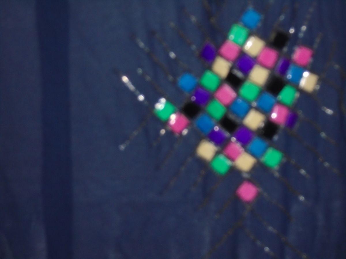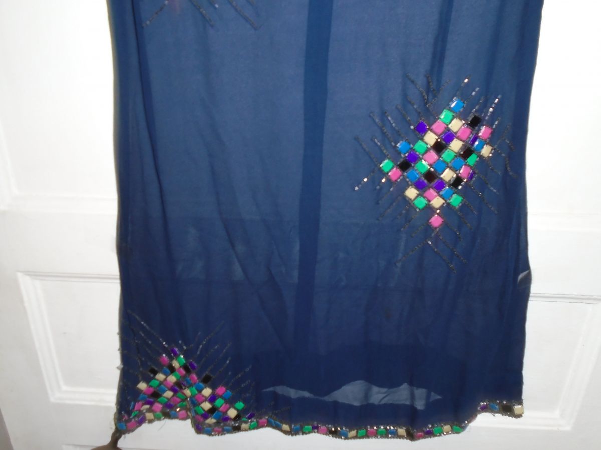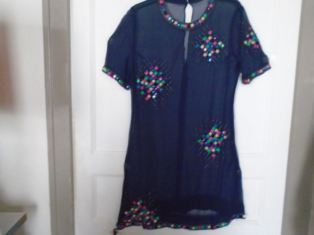 Tunique ou robe courte en mousseline marine brodée de pièces d'émaux de couleur (aucun manquant)