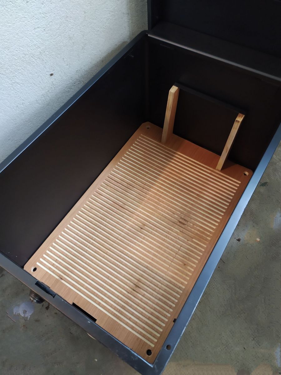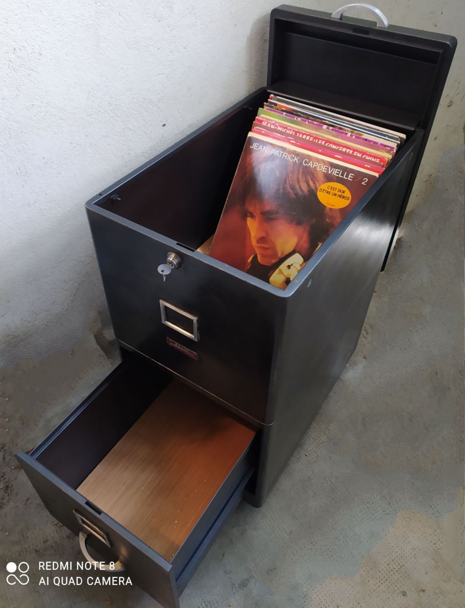 Ajout d une plaque de contreplaqué dans le.fond du tiroir et idem dans la partie haute avec 42 rainures pour y mettre des vinyles