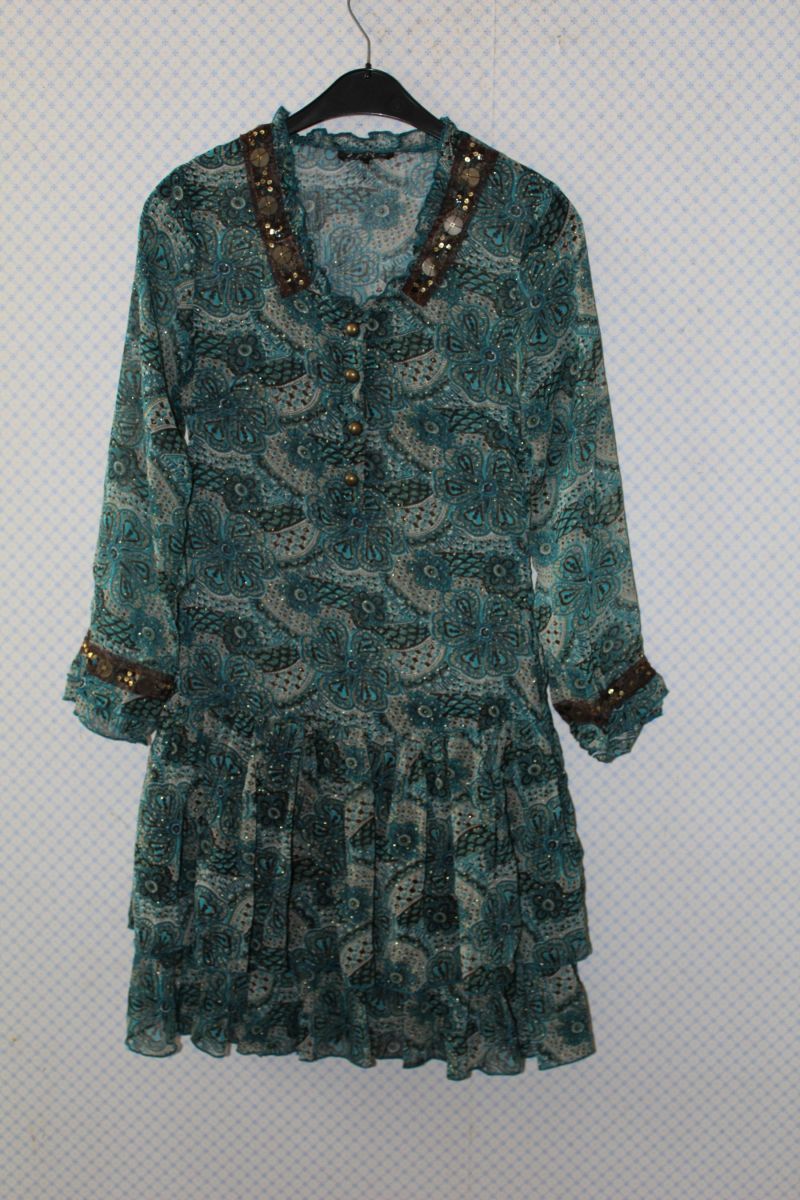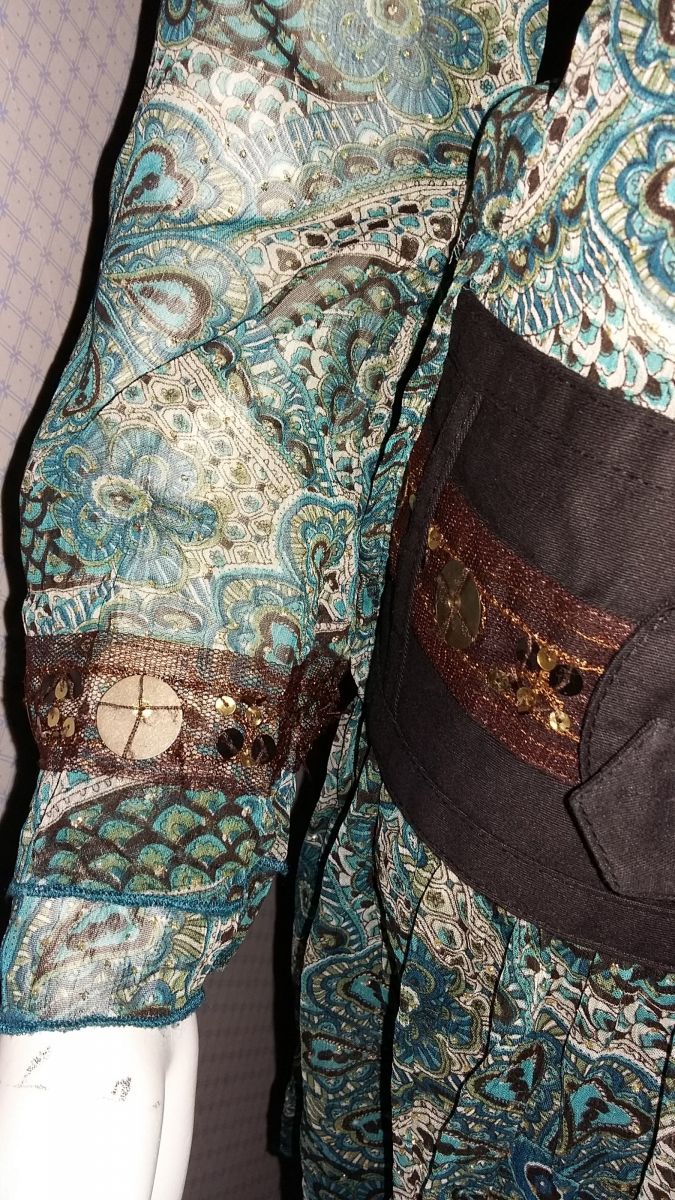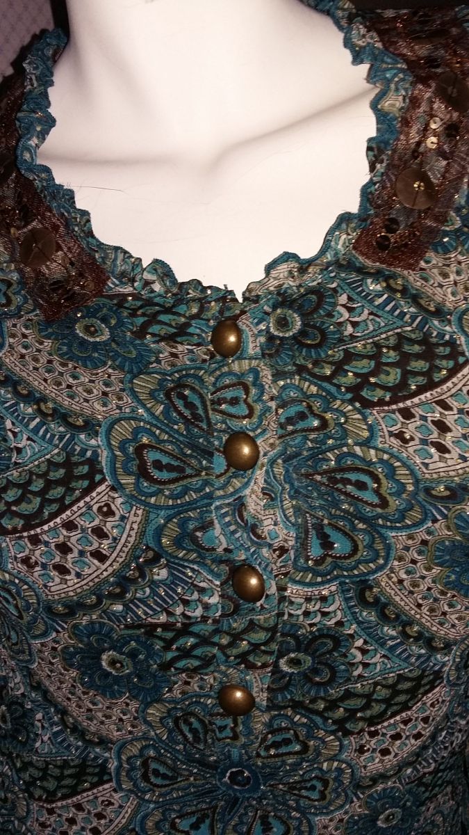 Encolure volantée ouverte devant avec 4 boutons cuivre.