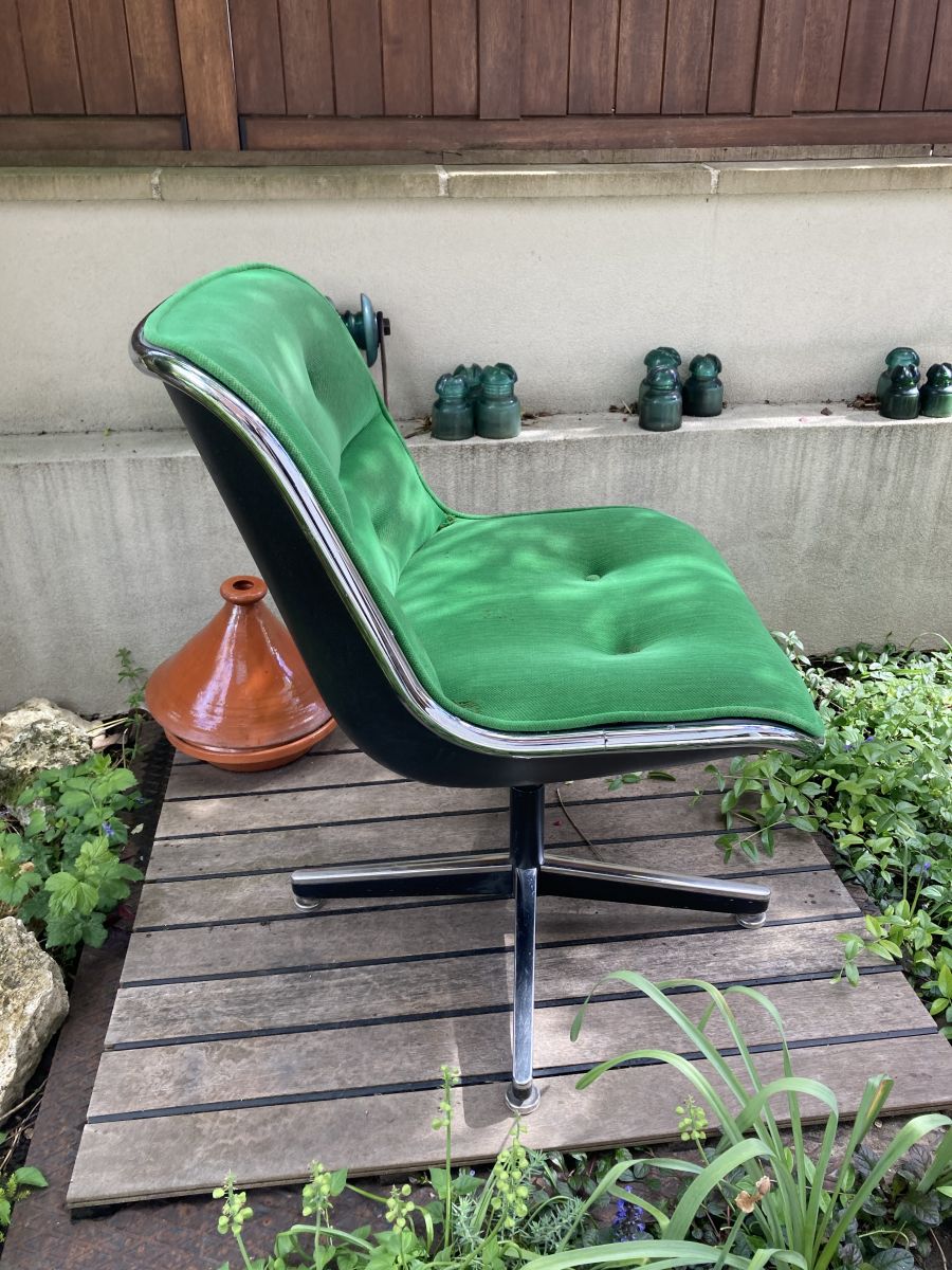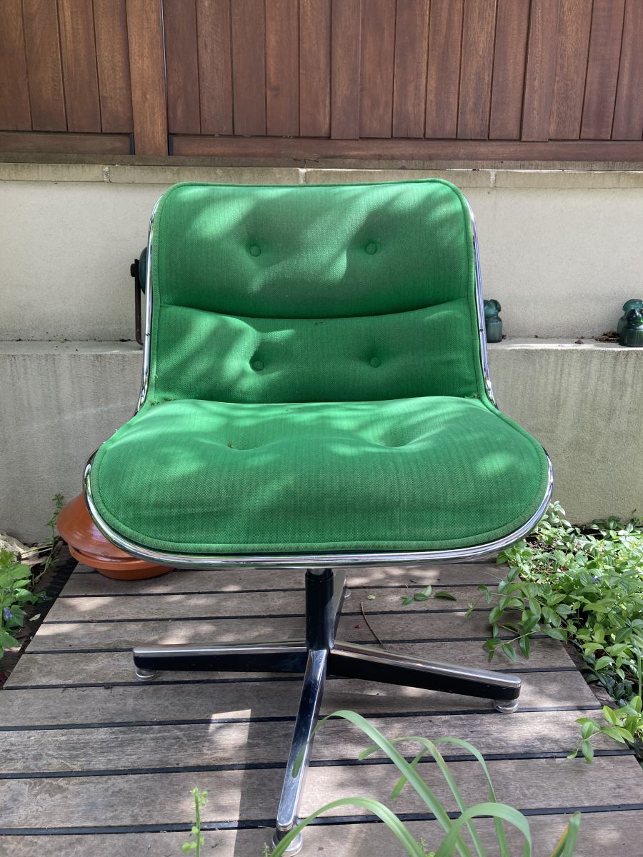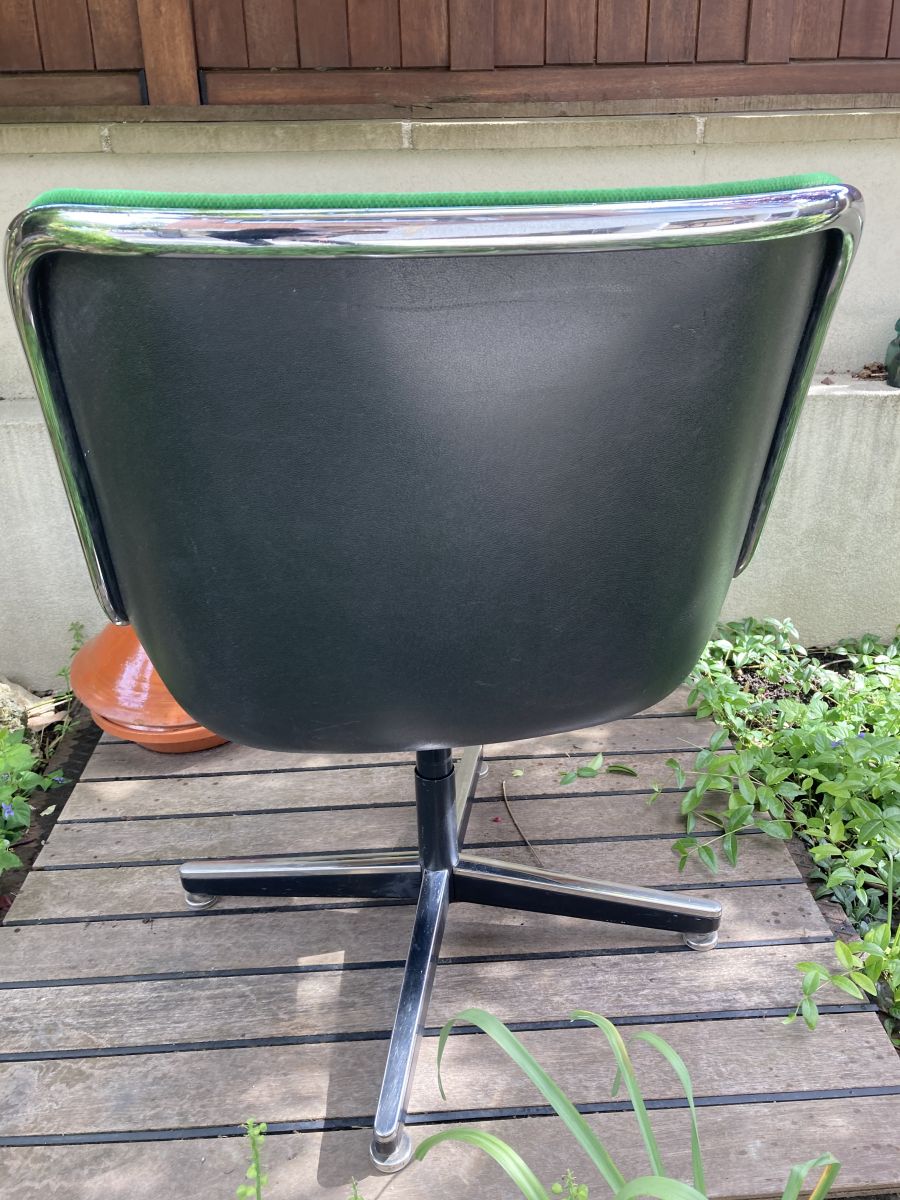 Designer - charles pollock. Producteur - knoll. Modèle - executive chair. Période de conception - 1970. Mesures - largeur 60cm X profondeur 47cm X hauteur 83 cm X hauteur d'assise 49 cm. Matériaux - velours, chrome, métal. Couleur vert gazon.usures conforment à l'âge et à l'usage. Le velours s’est effiloché à trois endroits sur l’assisse, voir photos des détails. Le fauteuil est pivotant mais pas ajustable en hauteur, sans accotoirs.