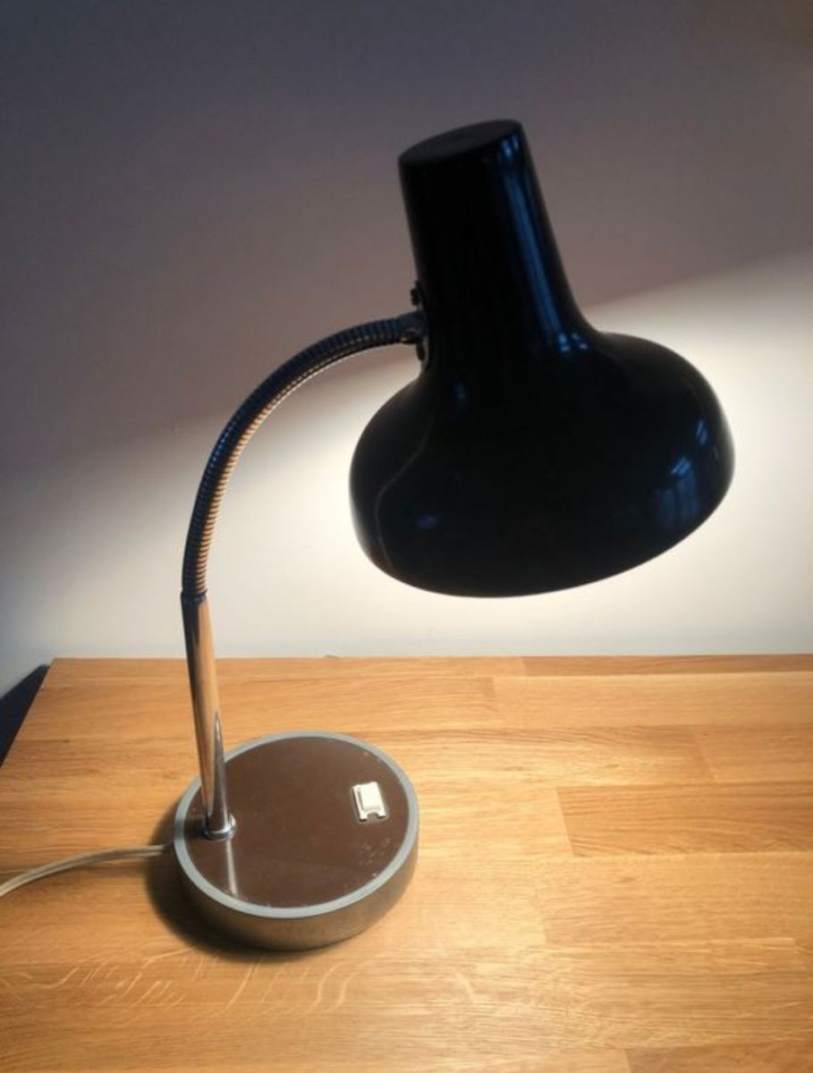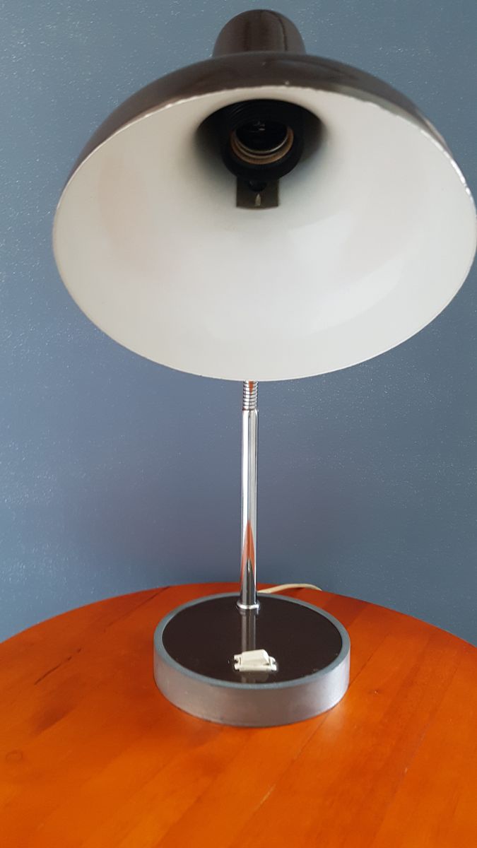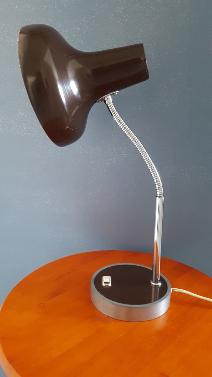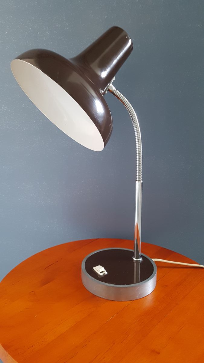 Lampe de bureau vintage des années 60/70. Cette lampe avec abat-jour en métal marron et interrupteur est en bon état vintage. Le commutateur est un peu lâche mais fonctionne très bien.