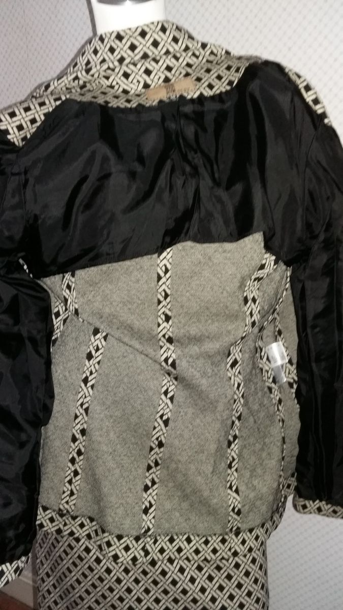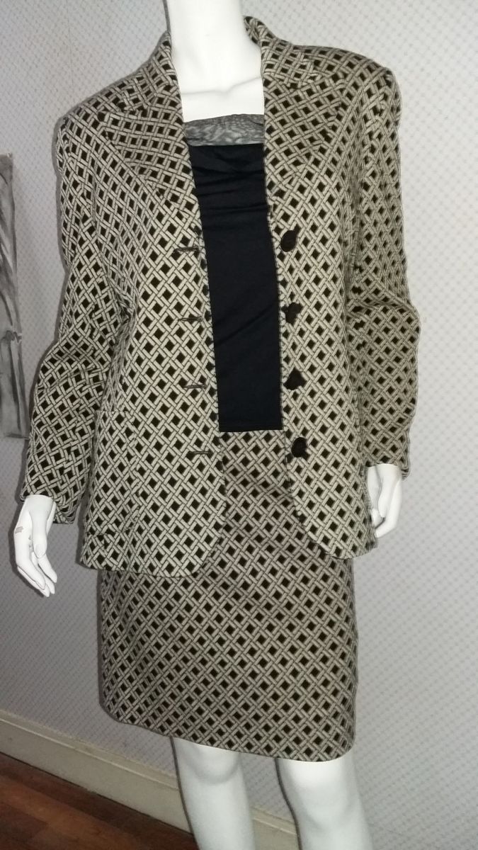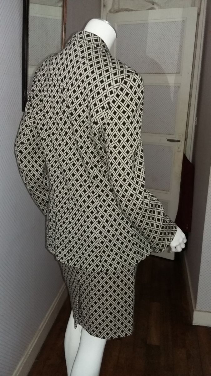 Beau tailleur jupe vintage au tissage, souple et de bonne tenue, infroissable, motifs graphiques noir et beige grisé.