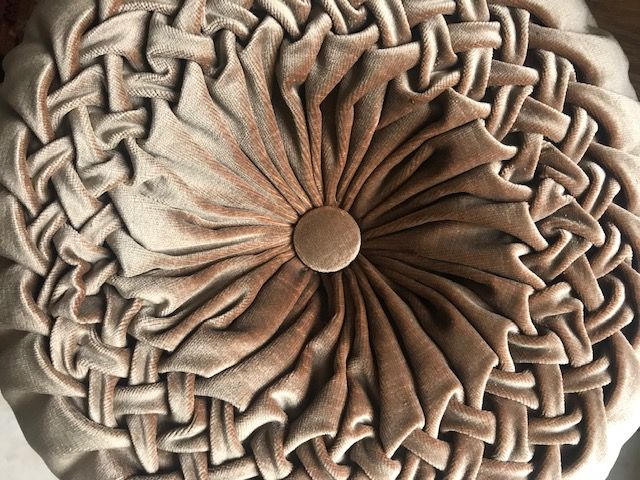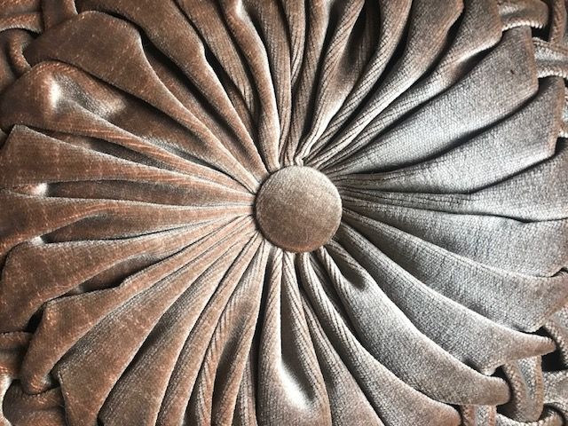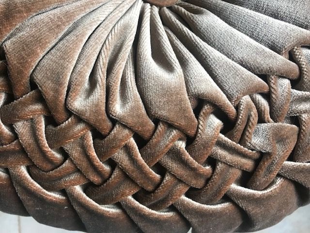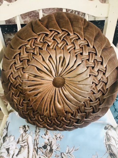Superbe coussin rond plissé en velours marron glacé et très chatoyant, d'où les différentes nuances visibles sur les photos.