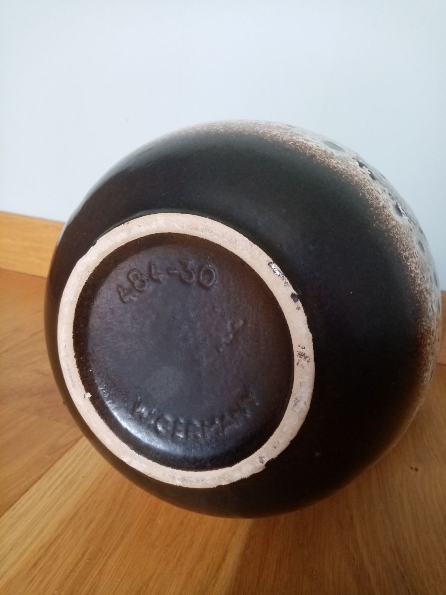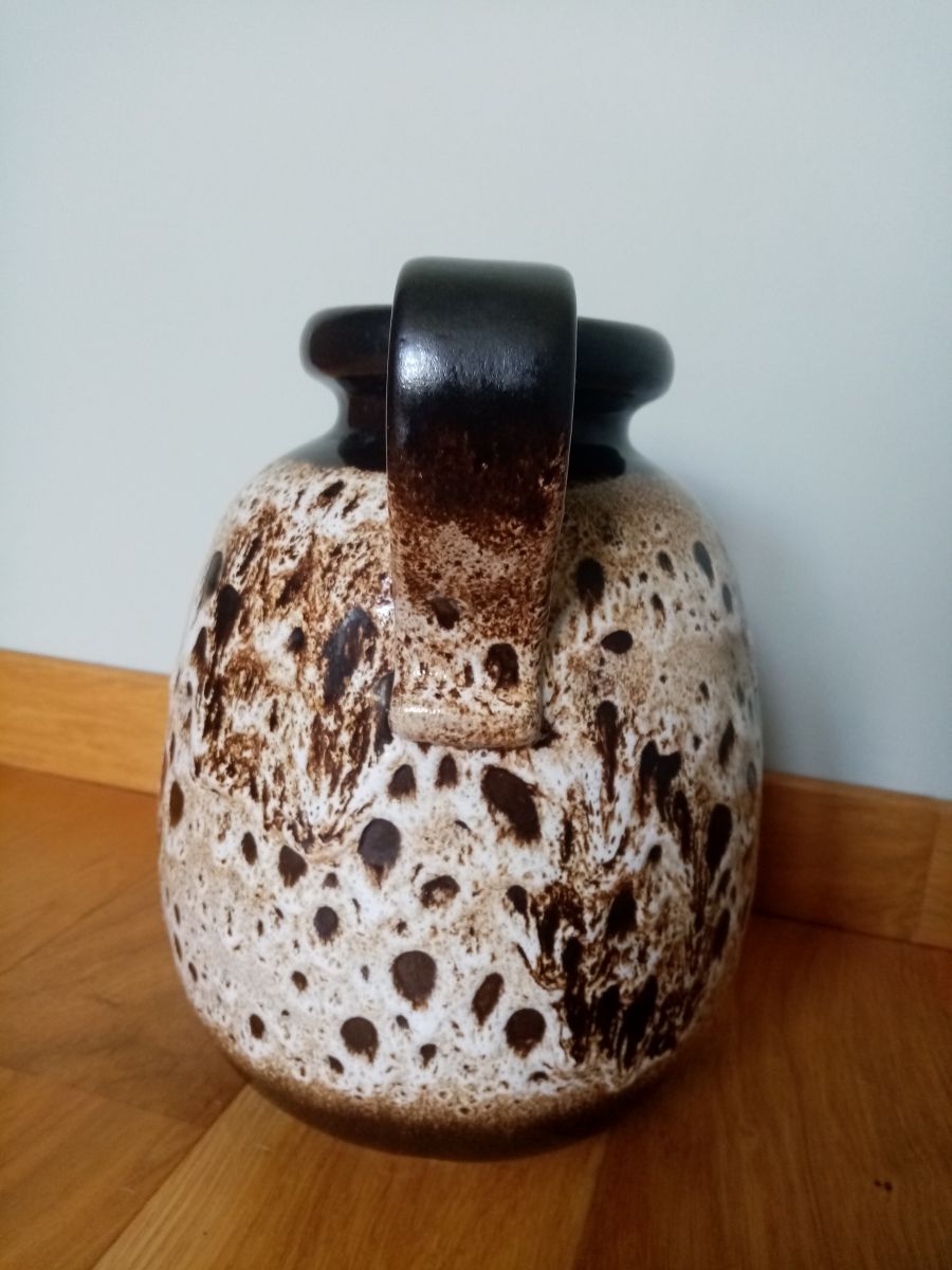 Très beau vase fabriqué en Allemagne de l'ouest ( marque « 484-30 West Germany » dessous, 30 étant la hauteur et 484 le numéro du modèle). On peut donc le dater d'avant la chute du mur de Berlin en 1989. Son émaillage en relief bouillonnant, dit fat lava, dans les tons marron et beige donne des envies de cappucino, de café crème, parfait pour un intérieur cocooning; ) Il est en très bon état, pas de fêle, juste un petit éclat sur le pourtour intérieur de l'ouverture (voir photo) et quelques traces sous la base. Il mesure 30 cm de haut, 23 cm environ de diamètre et pèse 3045 g.