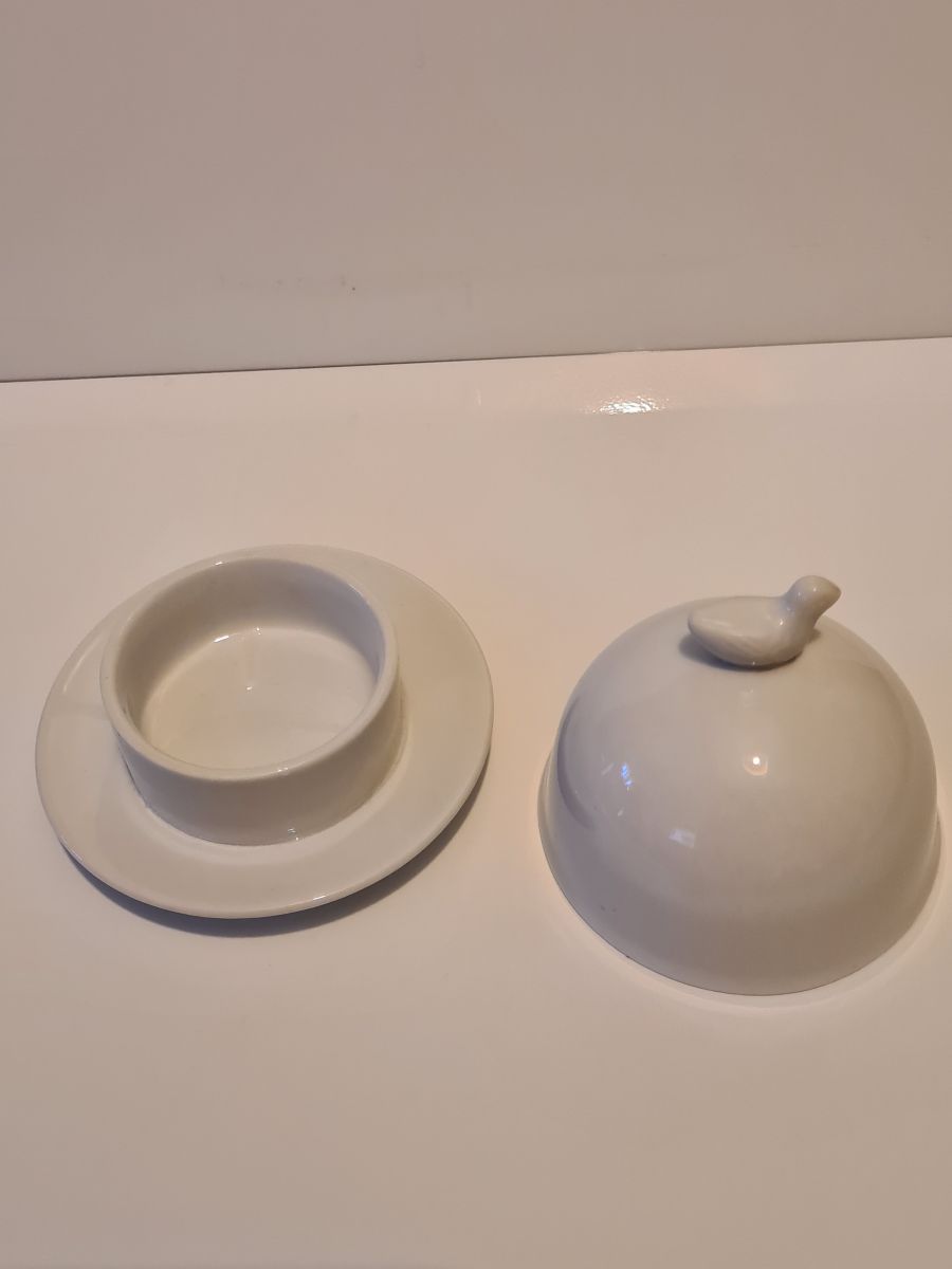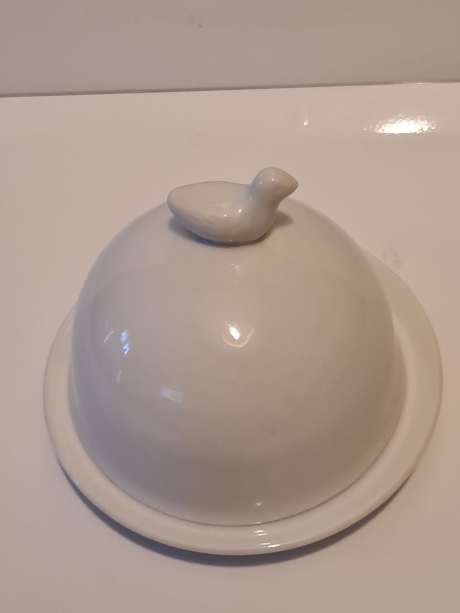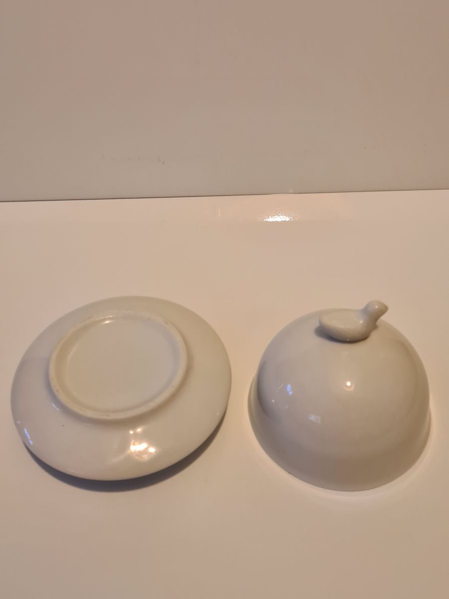 Beurrier en porcelaine blanche décor oiseau en excellent état, sans fêle Dimensions : H. 8cm X L. 8cm X P. 8cm