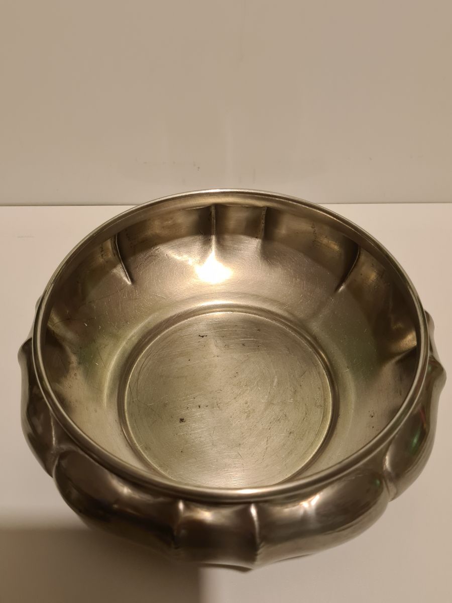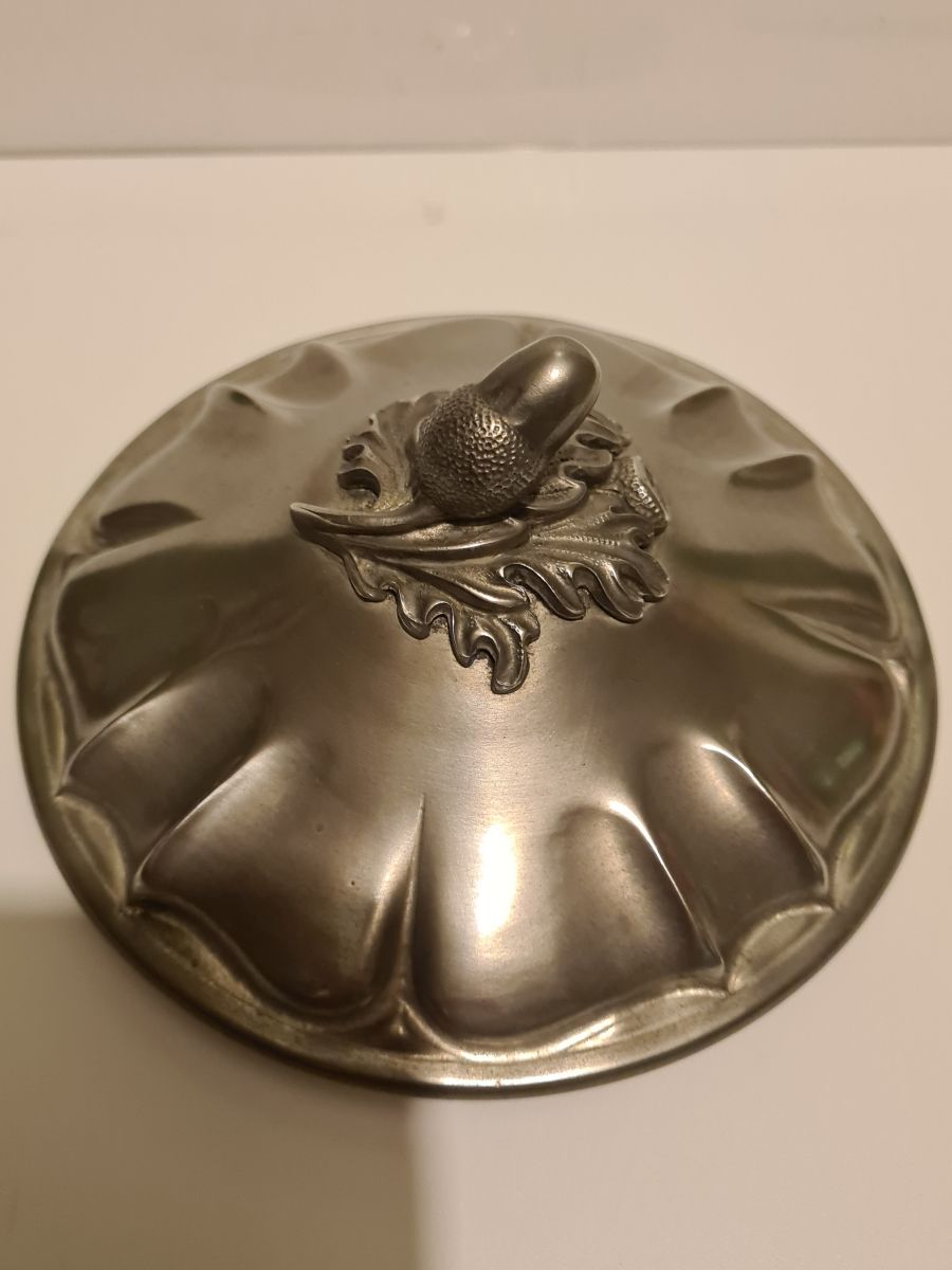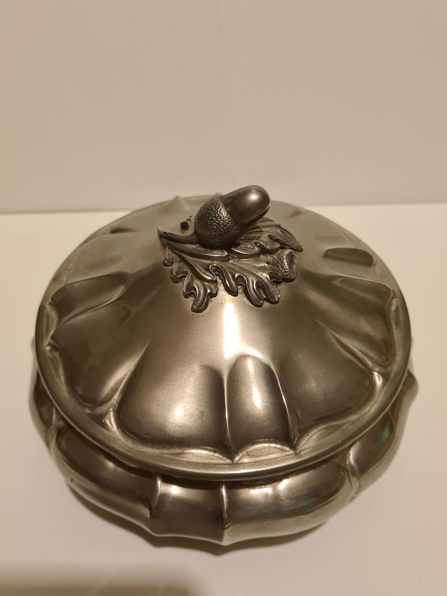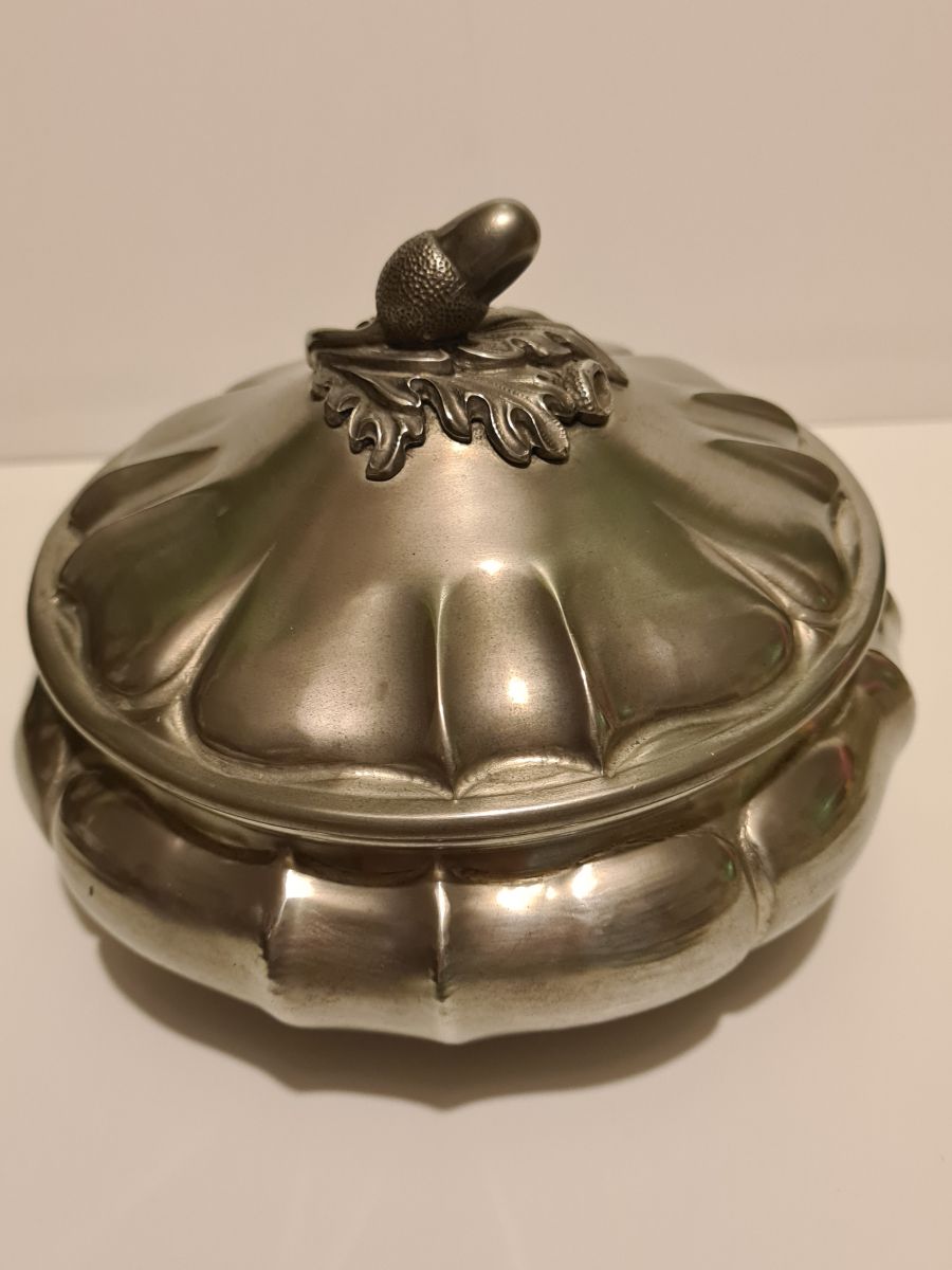 Boîte étain au décor canelé et poignée noisette poinçon presque effacé en très bon état Dimensions : H. 12,5cm X L. 15cm X P. 15cm