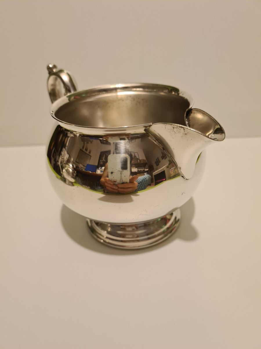 Pot à lait métal argenté MR Silver Plated style Rocaille, origine anglaise en très bon état avec quelques traces d'usage (voir photos) Dimensions : H. 8,5cm X L. 16cm X P. 9cm