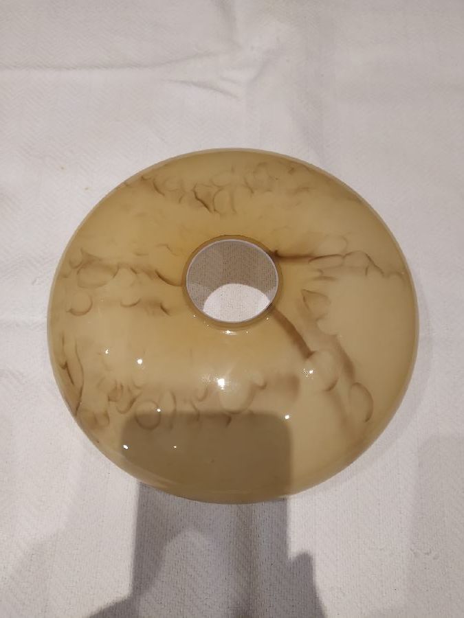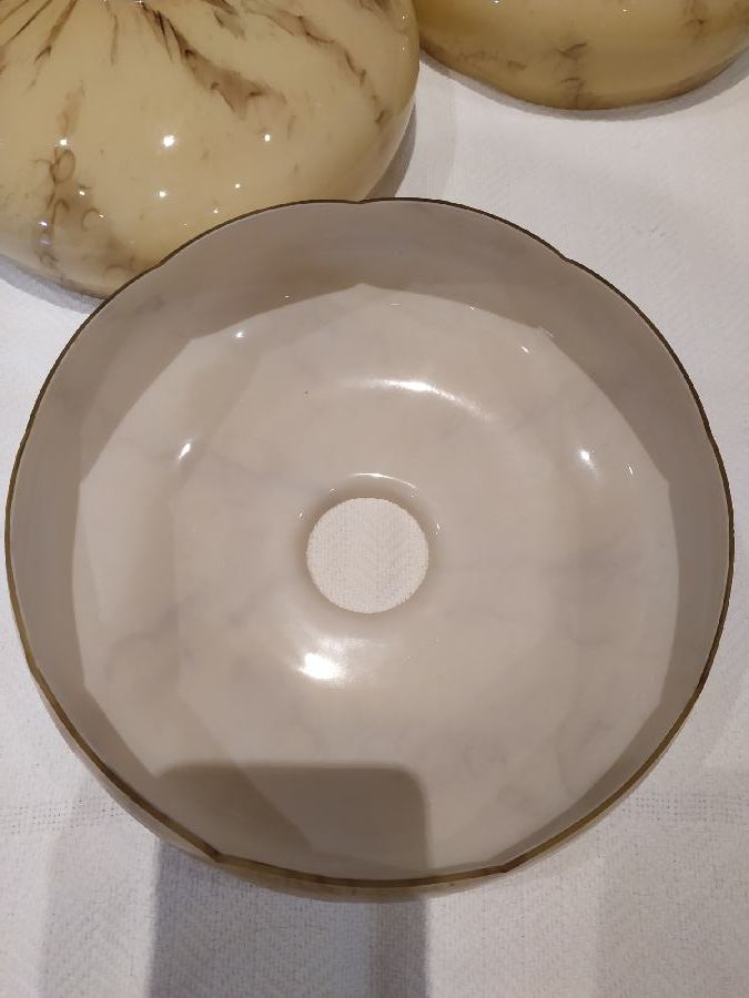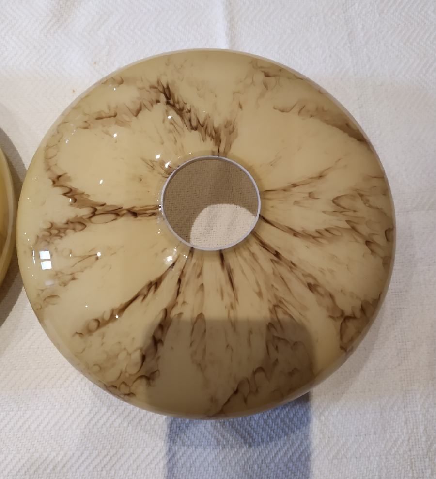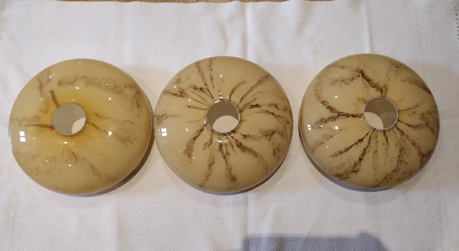 Lot de 3 abat-jours suspension en verre marbré et dentelé. Diamètre extérieur 23 cm, intérieur 20 cm.