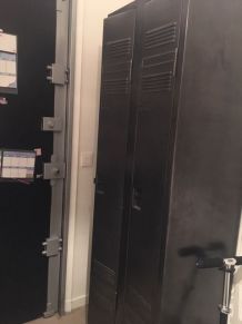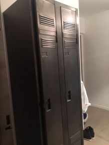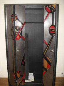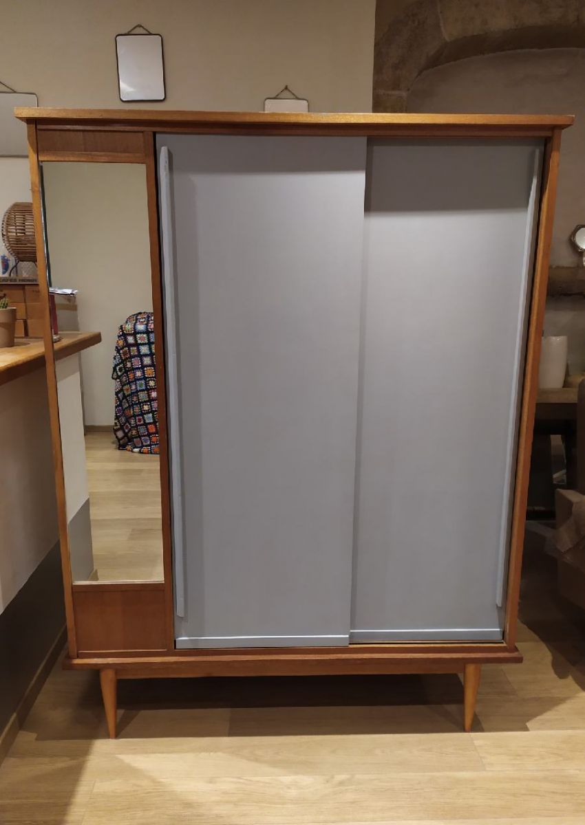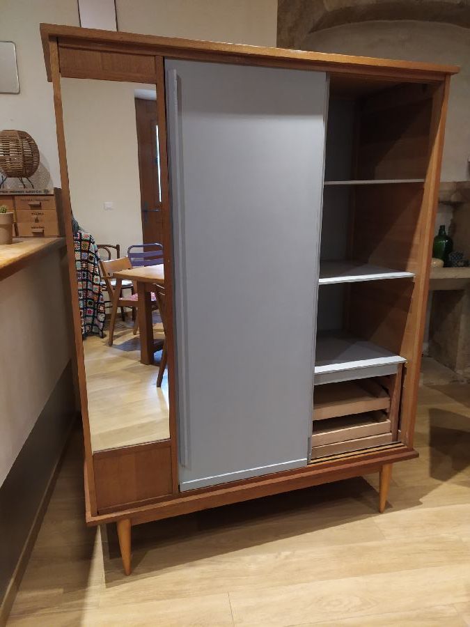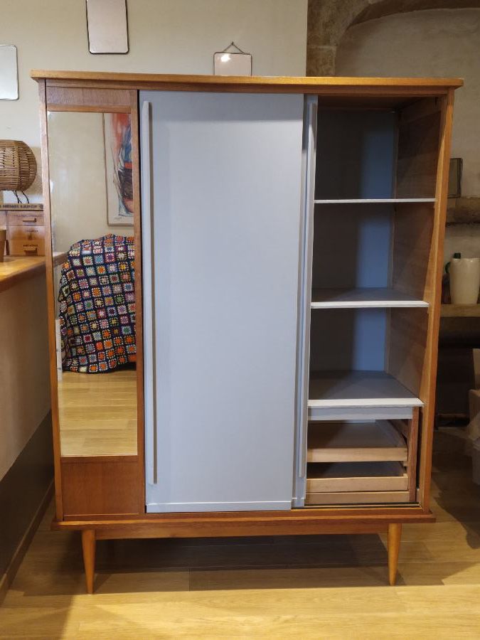 Armoire à portes coulissantes, un côté étagères et un côté penderie ( tringle à ajouter). Portes et étagères peintes en vert de gris. Des années 60 donc forcément quelques traces d'usage. Envoi armoire démontée.