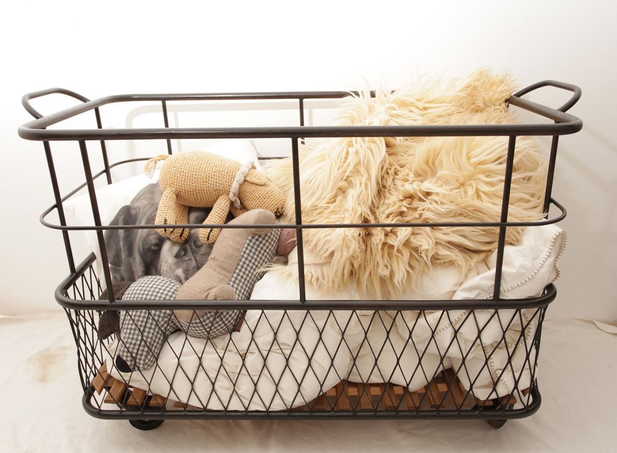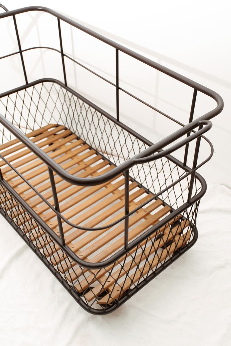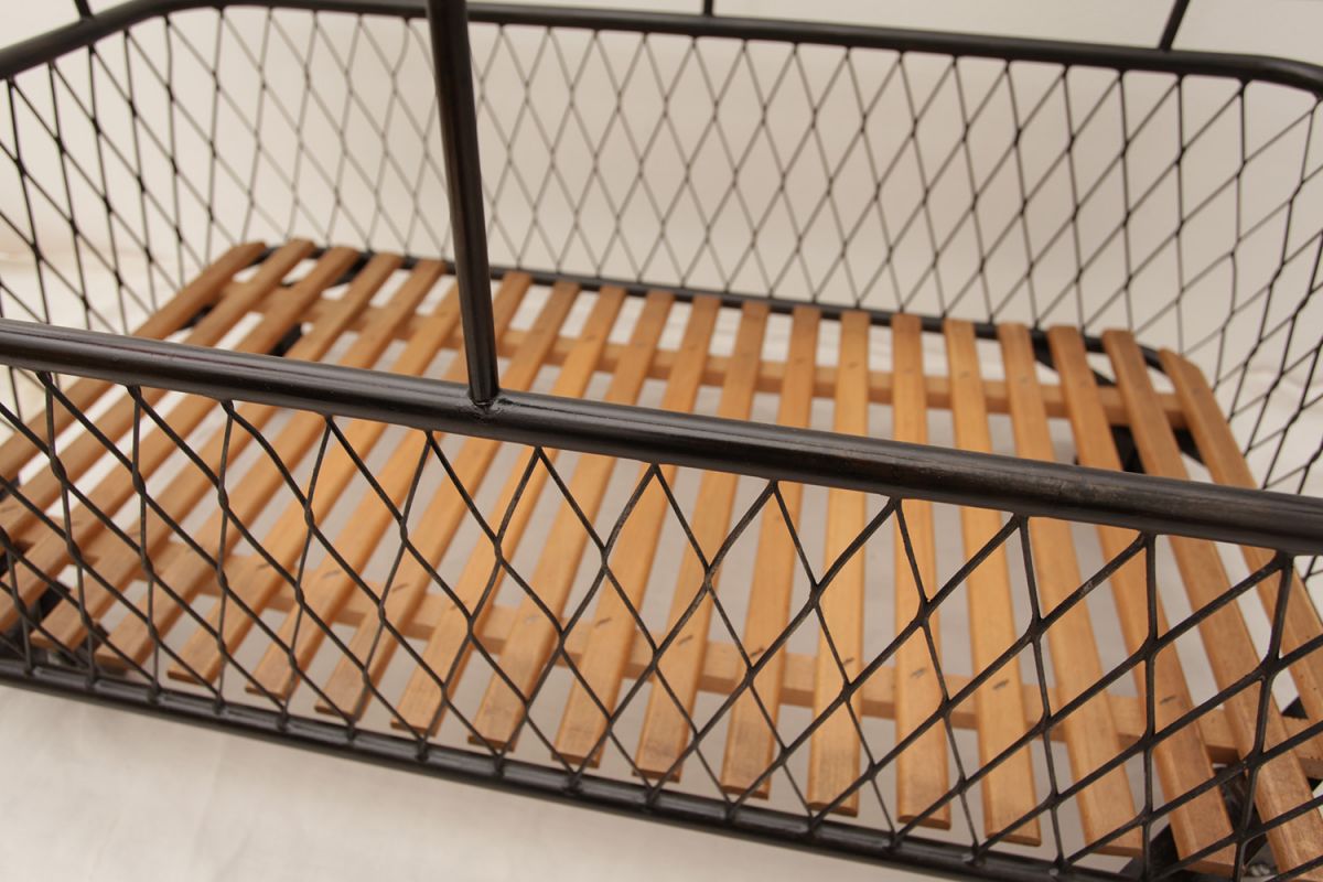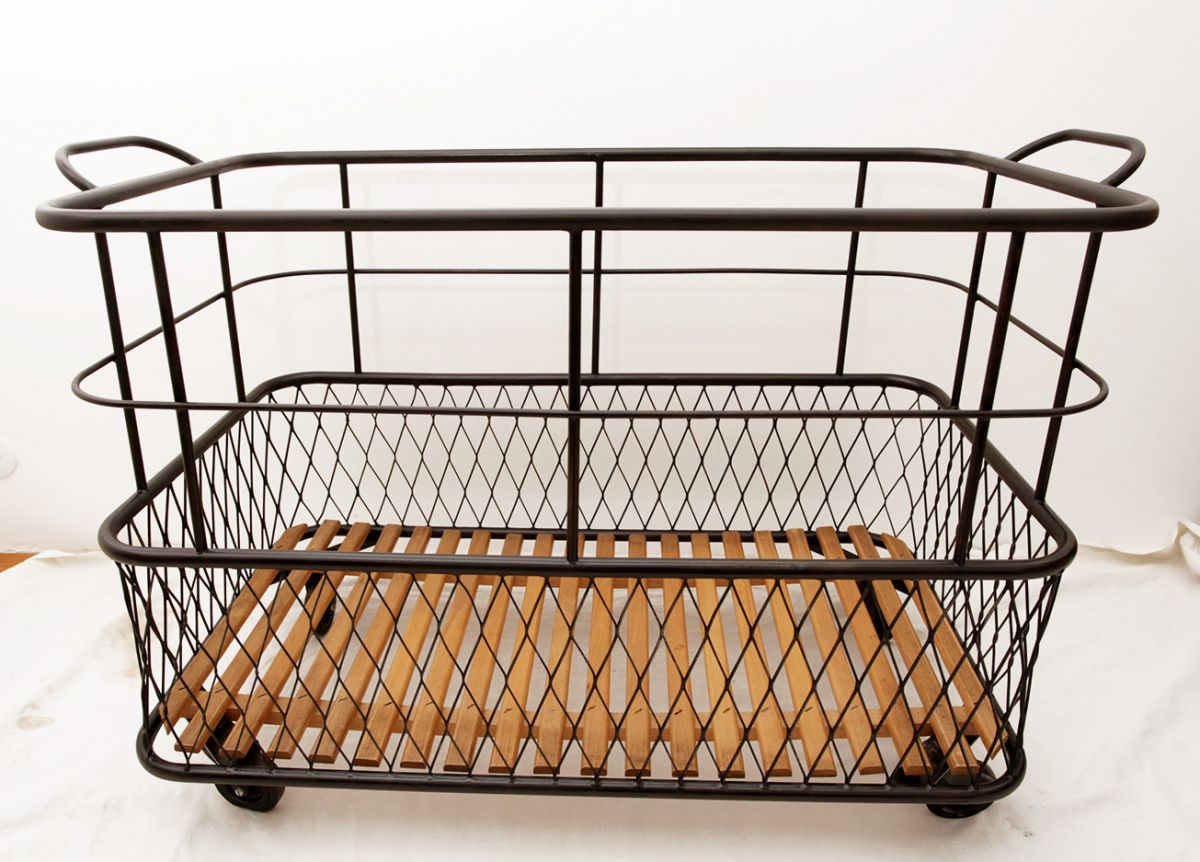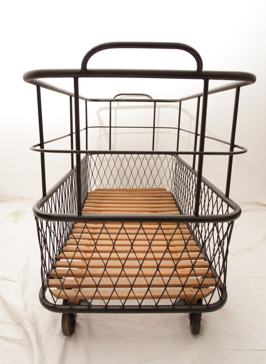 Rare, chariot à pain de boulanger années 50, en métal et grillage. Il permettait de transporter les pains cuits. En parfait état, le grillage et soudures sont impeccables, les lattes de bois parfaites. Très belle patine aux nuances sombres fumées. Sur roulettes. Le fond est en bois latté verni. L’ensemble est verni donc parfaitement propre pour y placer du linge, coussins, couettes, bois de chauffage, etc. L53 X h69 l93 de long sans les anses.