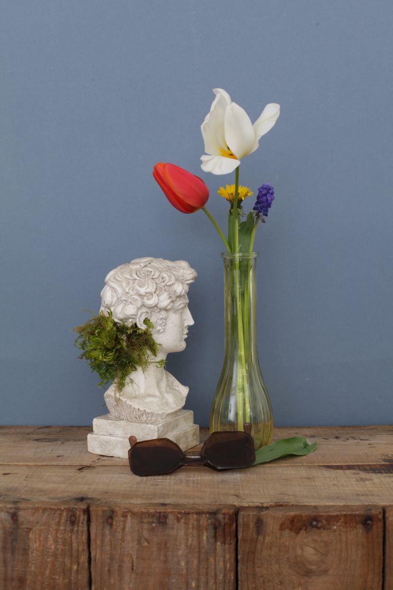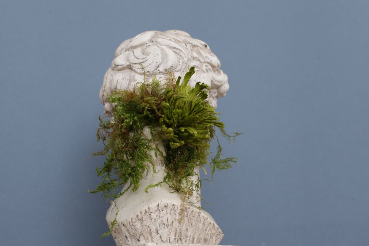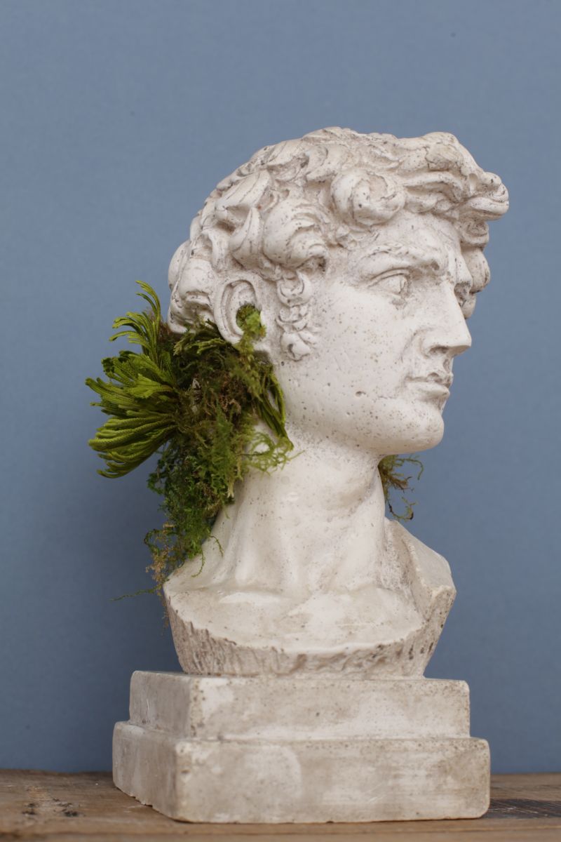 Sculpture en plâtre plein. Belle petite pièce de décoration, qui peut se placer facilement sur un bureau, une étagère. Réhaussée d’une composition végétale délicate (séchée et stabilisée) qui donne un aspect de sculpture de jardin extérieur mais appréciable en intérieur. Très beau contraste avec le végétal et la matière plâtre. Objet de décoration original. Petite série numérotée et signée, chaque composition végétale est minutieuse et unique. Ici, pièce n°12. Ne pas exposer à une lumière du soleil directe (ou une lumière naturelle trop vive) et à la chaleur. Dimensions du plâtre seul sans le végétal: Hauteur de la tête: 22 cm. Largeur du socle: 9 cm.