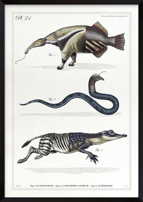 Chimères composées avec 6 anciennes gravures datant de 1850. C’est une manière étonnante et ludique de redécouvrir ces superbes gravures d'époque. Ici, le tamanofish, la michipère commune et le zèbrodile. Pour amateur-rice-s d'illustrations hors des sentiers battus ! Tirage d'art réalisé en impression pigmentaire de très haute qualité sur papier 300gr. Le résultat est d’une grande précision, un rendu identique à une sérigraphie ou l’offset, mat et velouté. Tirage vendu seul sans le cadre (possibilité de l’obtenir encadré). D’autres chimères disponibles. Format a4 = 30 X 21 cm.