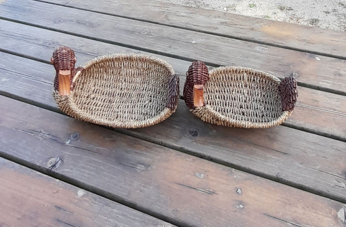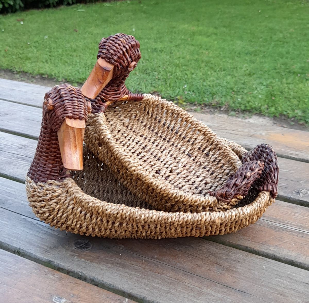 Ensemble de 2 corbeilles gigognes toutes jolies en vannerie (corde tressée) à bec de canard en bois.