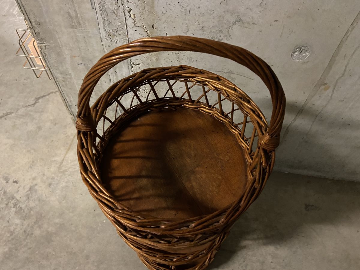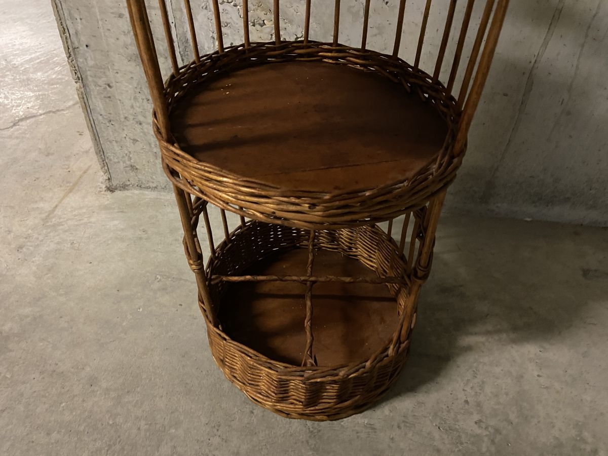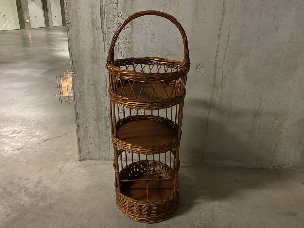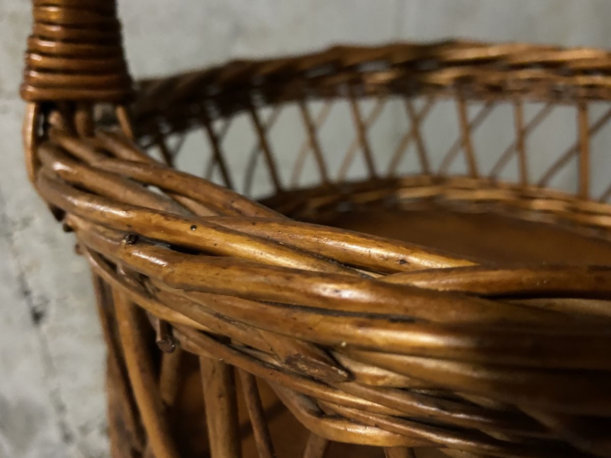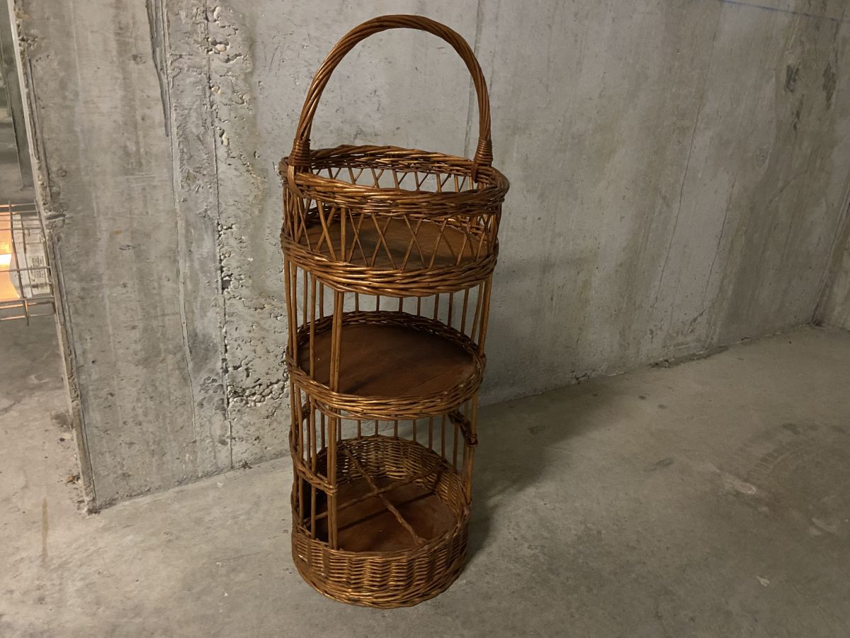 Desserte bar en rotin des années 70, 4 porte-bouteilles, très belle patine du rotin, hauteur avec la anse 88cm, diamètre plateaux 33cm, bon état.