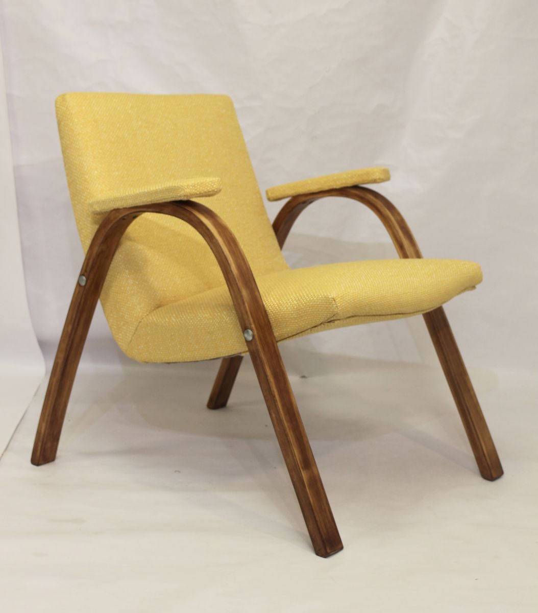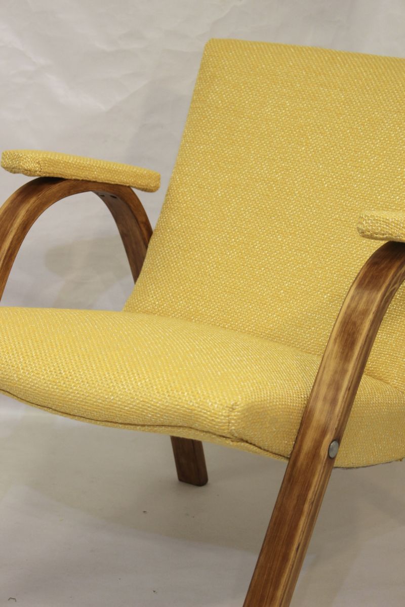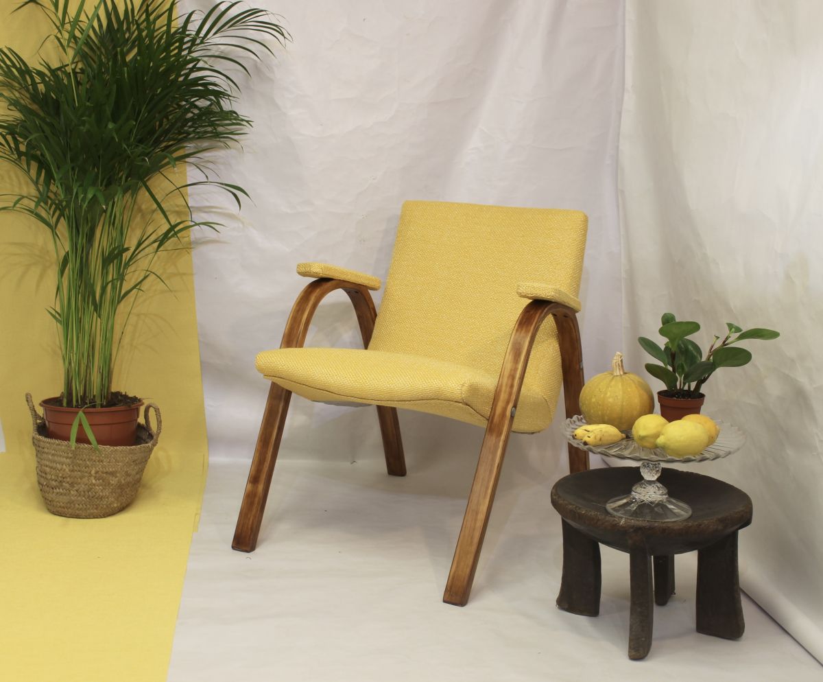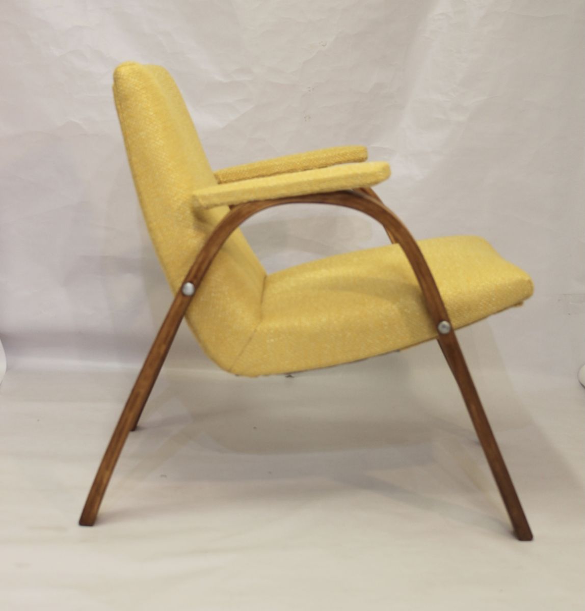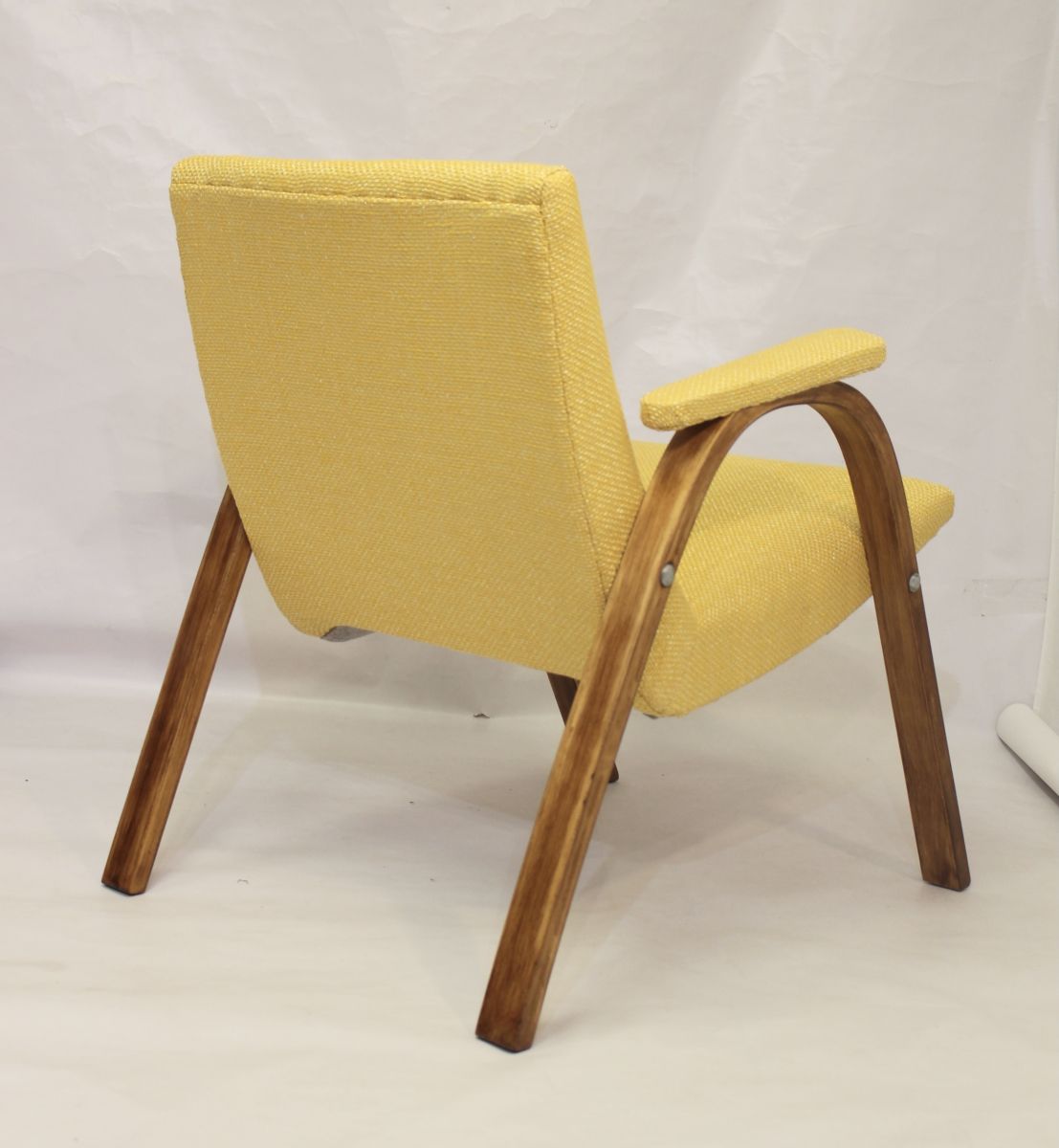 Fauteuil Bow Wood Edition Steiner design année 50. Accoudoirs courbés en hêtre parfaite état. Restauré entièrement et retapissé dans un tissu texturé d’un jaune lumineux création Kenzo édition Lelievre.µ