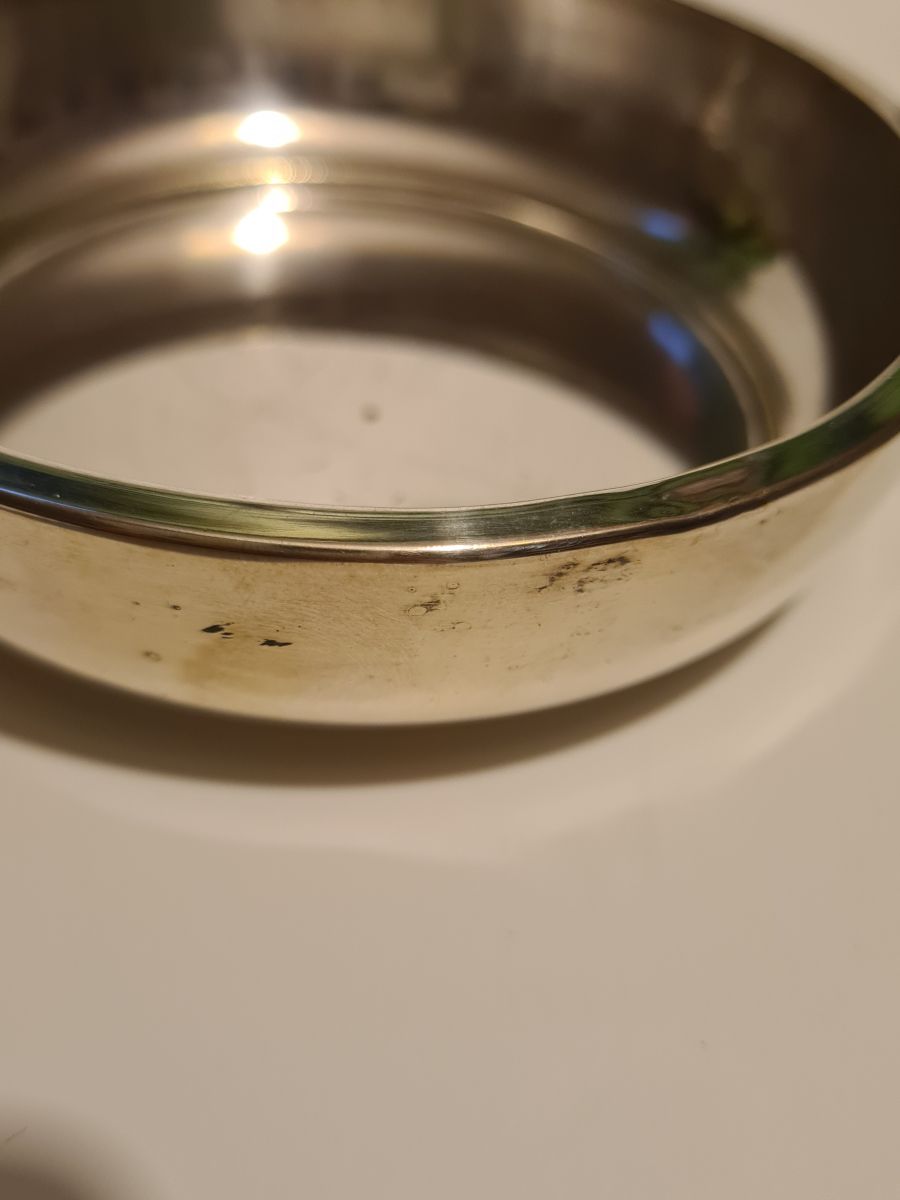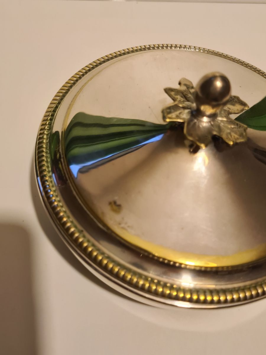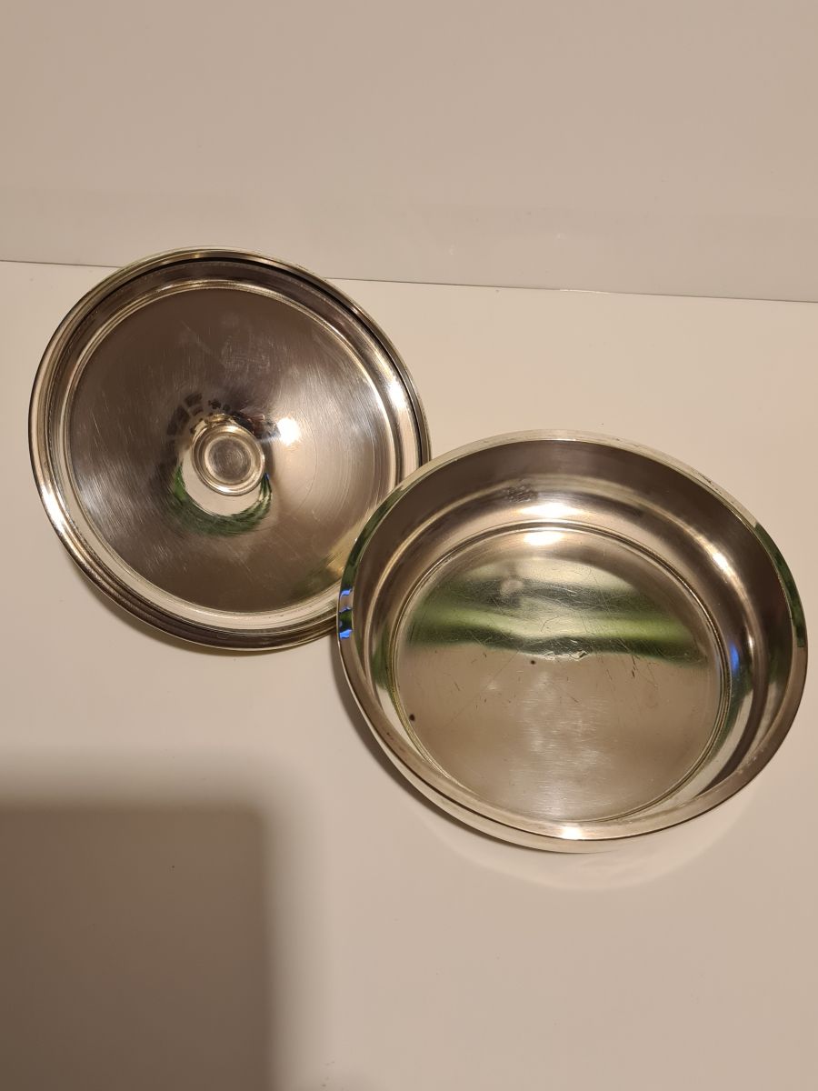 Bonbonnière ronde plate en métal argenté Iris silverplate Italy A1000, traces d'usages, un choc sur le couvercle bouton forme de feuille. Bon état Dimensions : H. 7cm X L. 12,5cm X P. 12,5cm