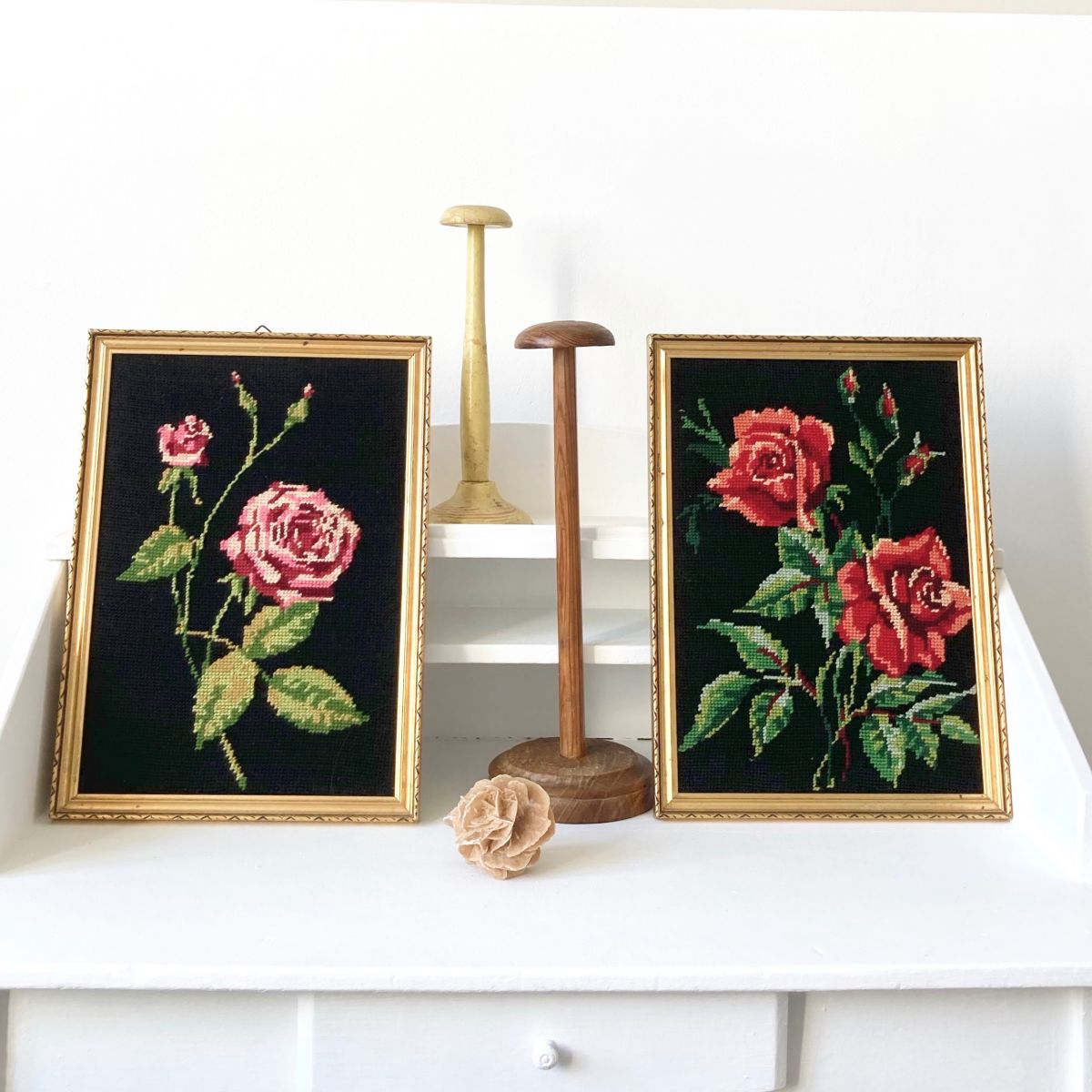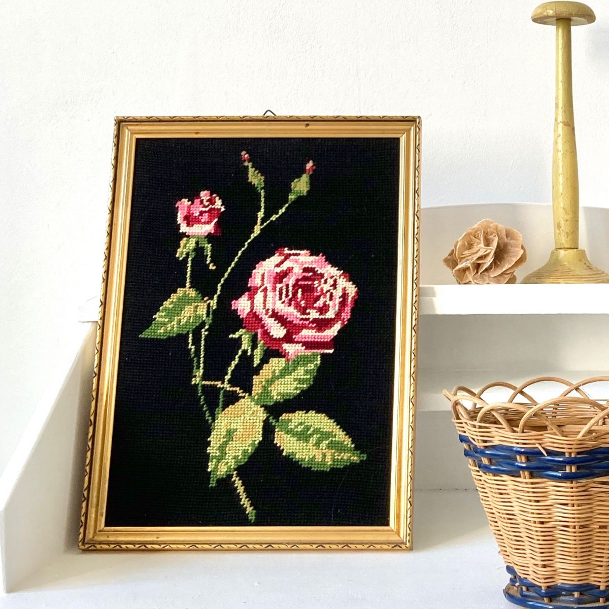 Cadre doré vintage représentant une branche de rosier rose, avec une fleur épanouie et des boutons sur fond de canevas réalisé à la main. Bon état, dim : 32,5 x 23 cm. Un autre est disponible dans ma boutique, version roses rouges pour faire la paire (n'hésitez pas à me contacter pour réduire les frais de port).