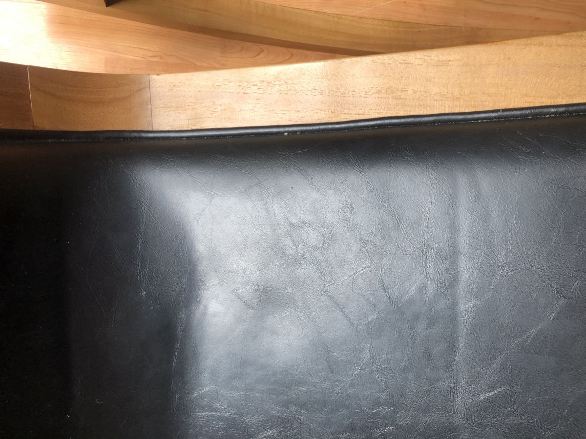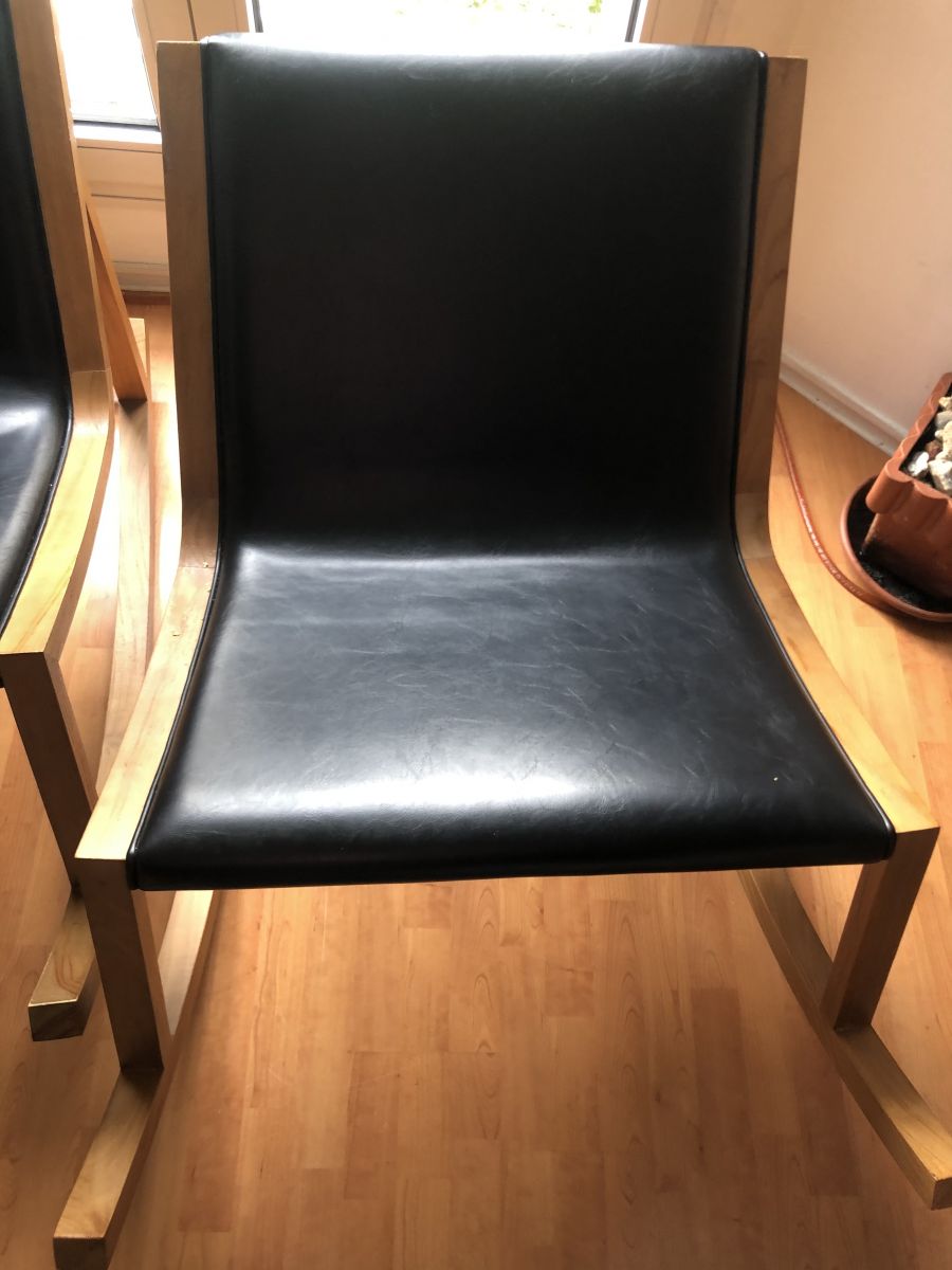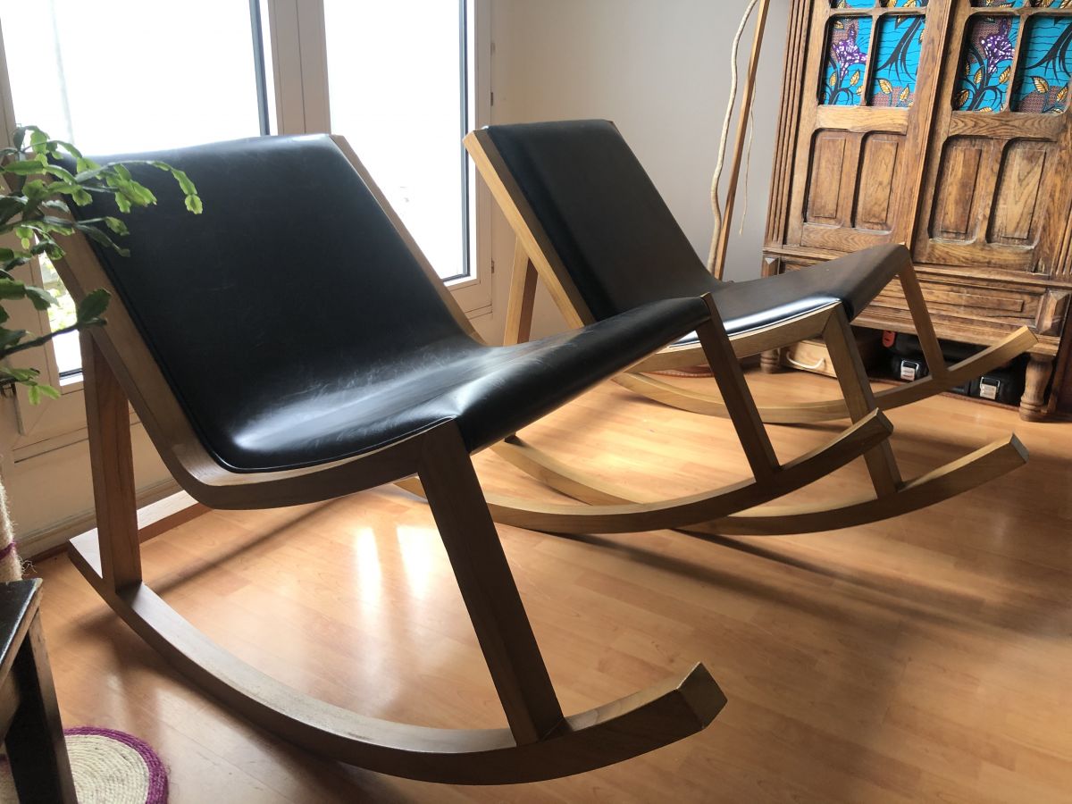Je vends 2 fauteuils à bascule design en bois massif et skaï noir. Style meuble scandinave vintage et rétro.