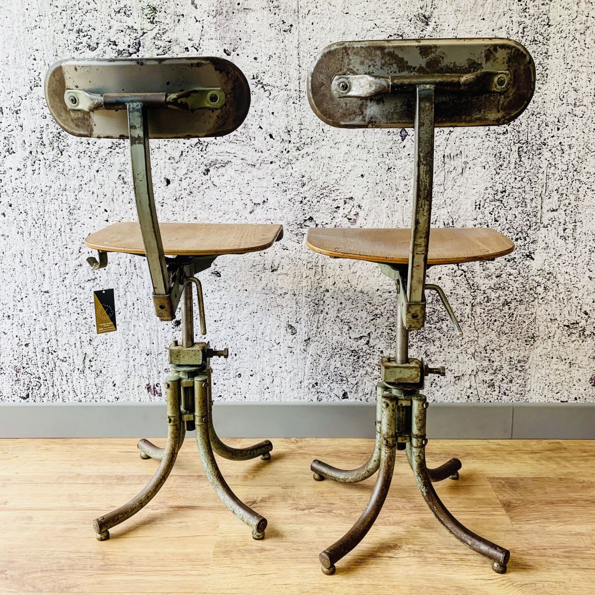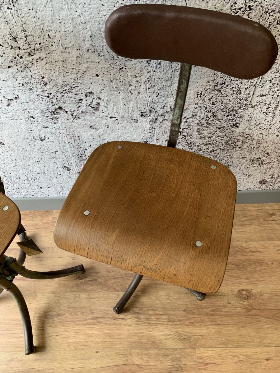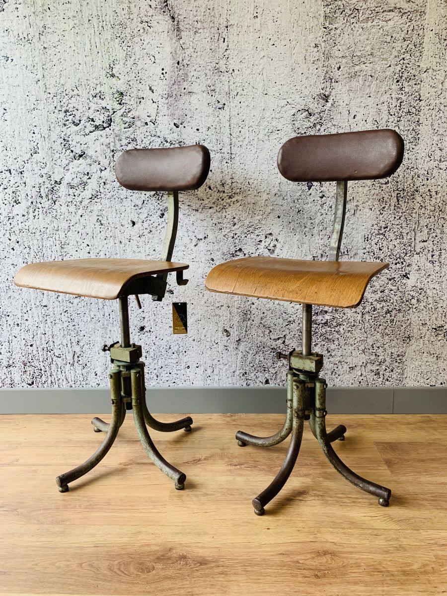 Superbe lot de 2 chaises biénaises de 1958 en bel état de conservation. Elles ont été nettoyé et vernis (mat). Le réglage de hauteur de l'assise va de 51 à 64 cm. Le dossier est en skaï marrons sans accroc. La rotation peut se bloquer par une goupille.