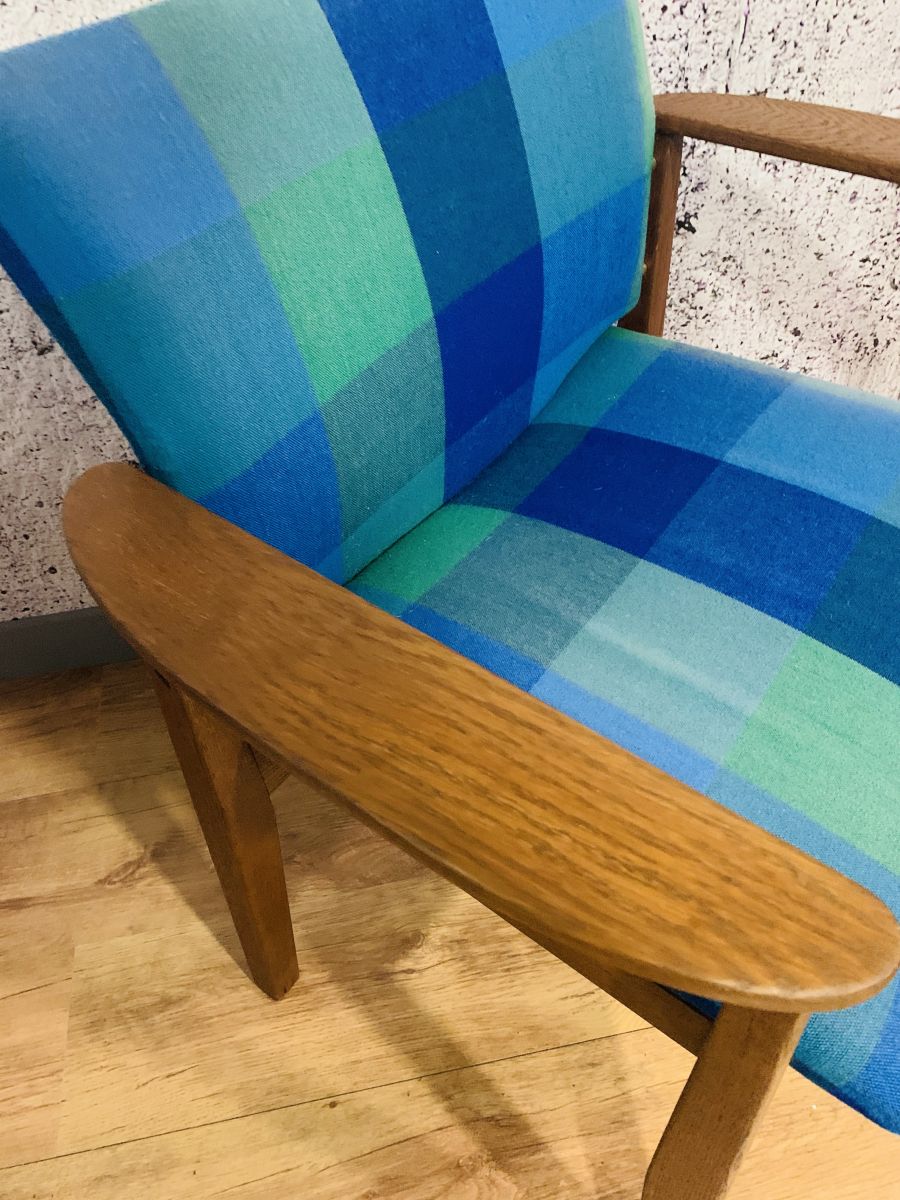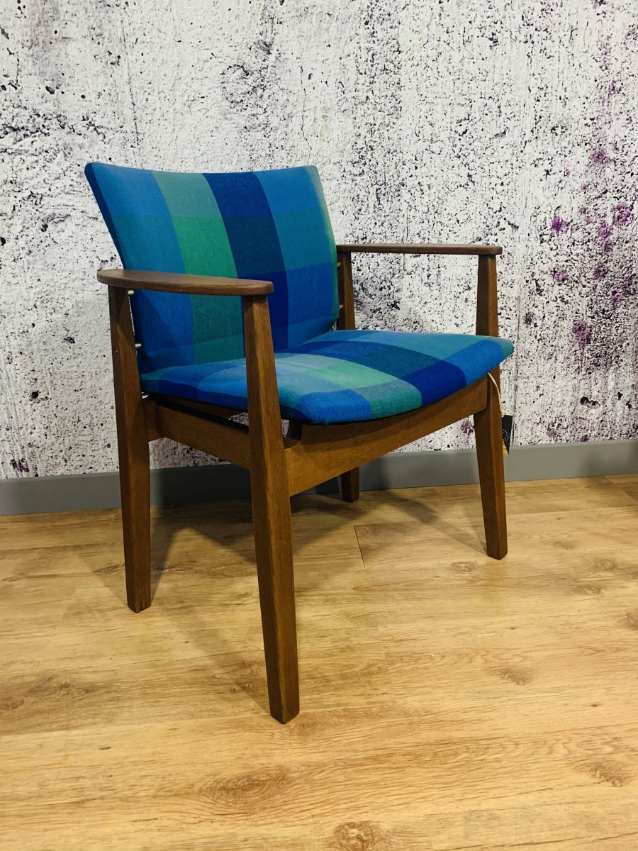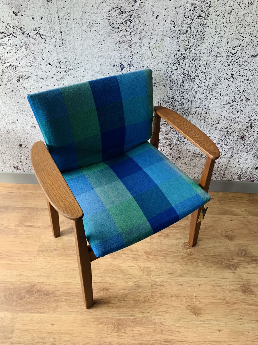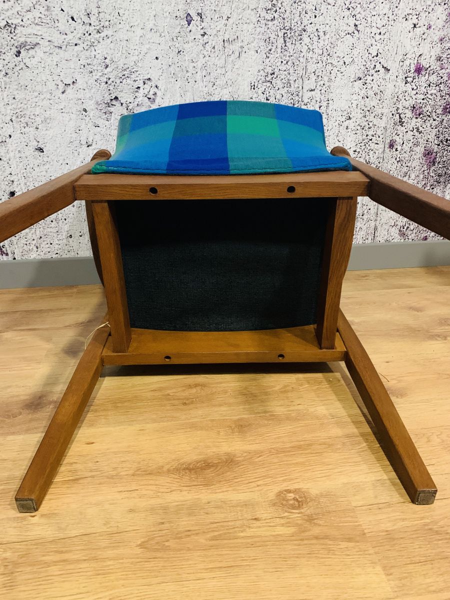 Superbe fauteuil scandinave.il a été nettoyé ( tissu d'origine ) et le bois à été poncé, teinté et ciré. Il est très confortable par sa grande largeur est ses accoudoirs. L'assise à été modifié par le remplacement des sangles et ajout d'un tissu noir sous l'assise. Il est très stable et sera parfait dans votre salon ou votre chambre !.