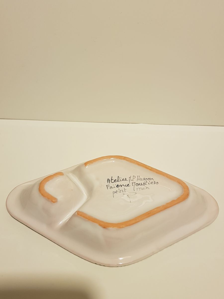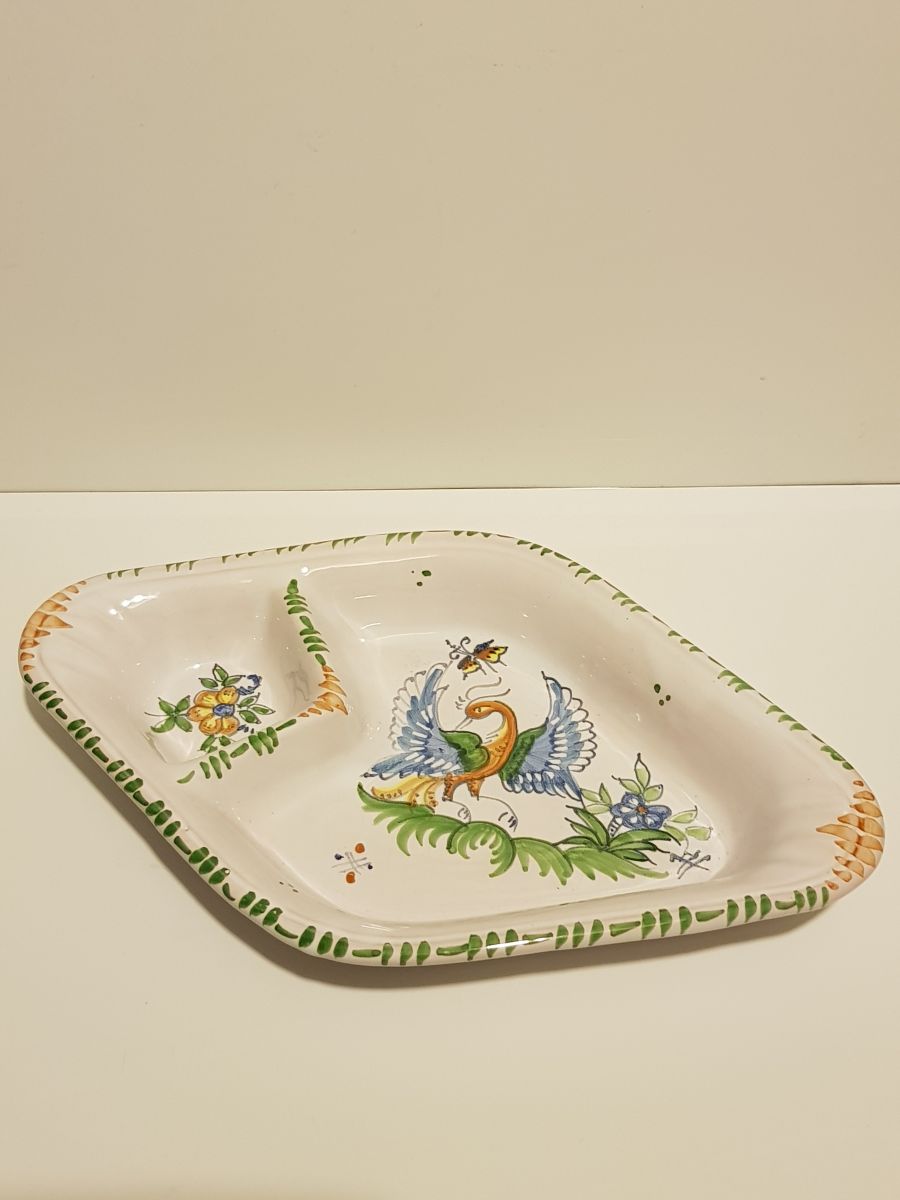 Petit plat 2 compartiments en faïence de Moustiers, Atelier M.P. Husson, peint à la main, décor Paon Dimensions : H. 3,5cm X L. 24cm X P. 14cm