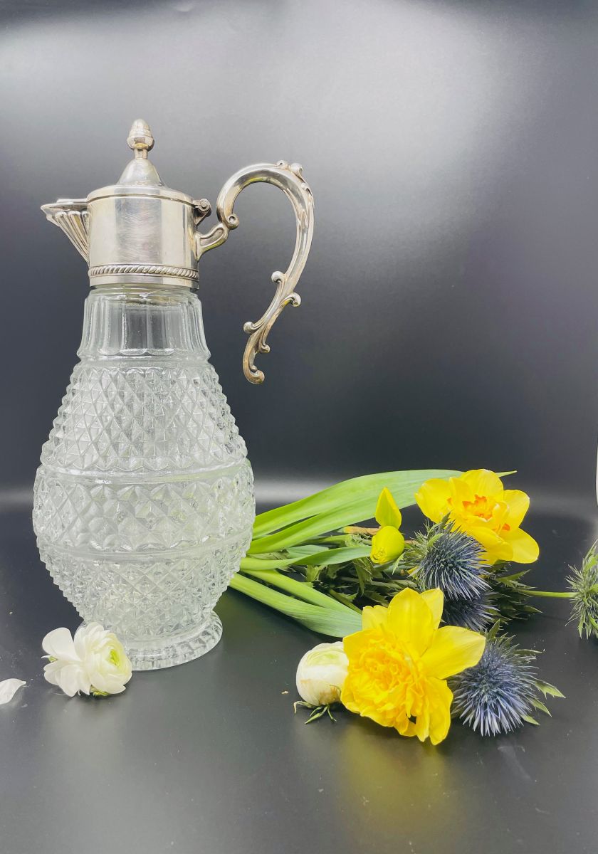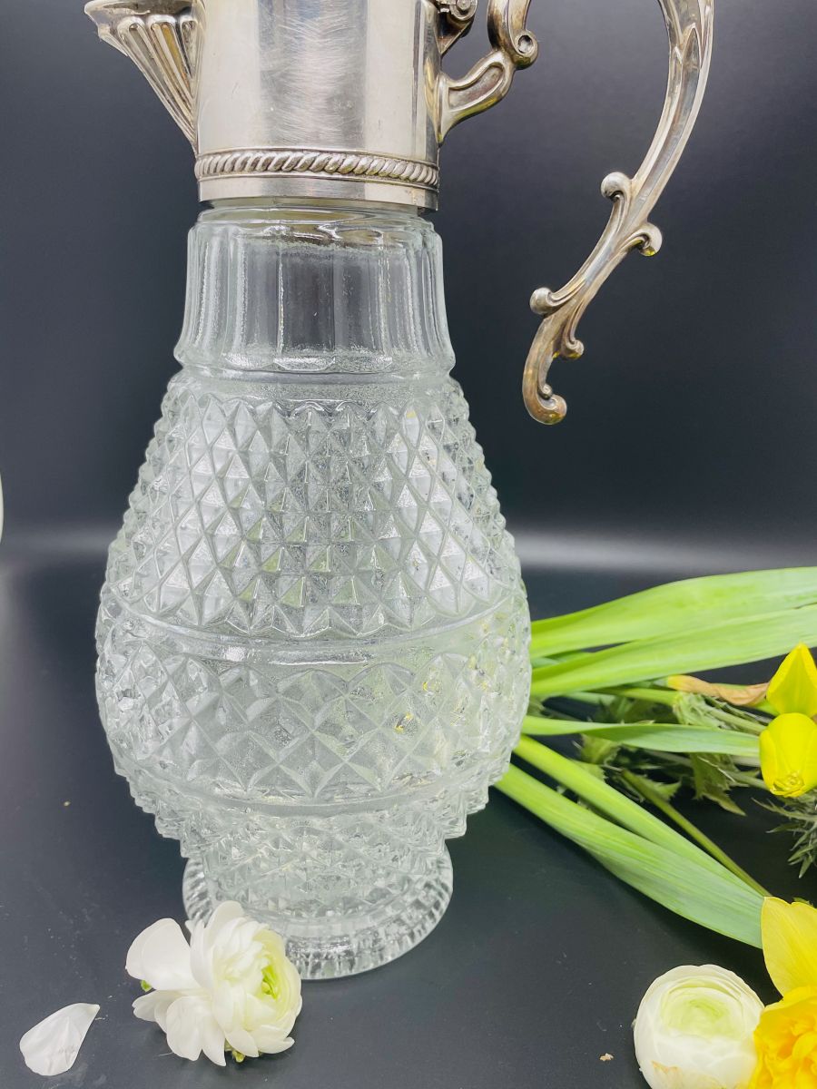 Jolie aiguière ou verseuse en verre moulé à décor de pointes de diamants et monture en métal argenté. Elle date du mi-XXième et on l'imagine très bien sur une belle table de fête ou pour décanter le vin.