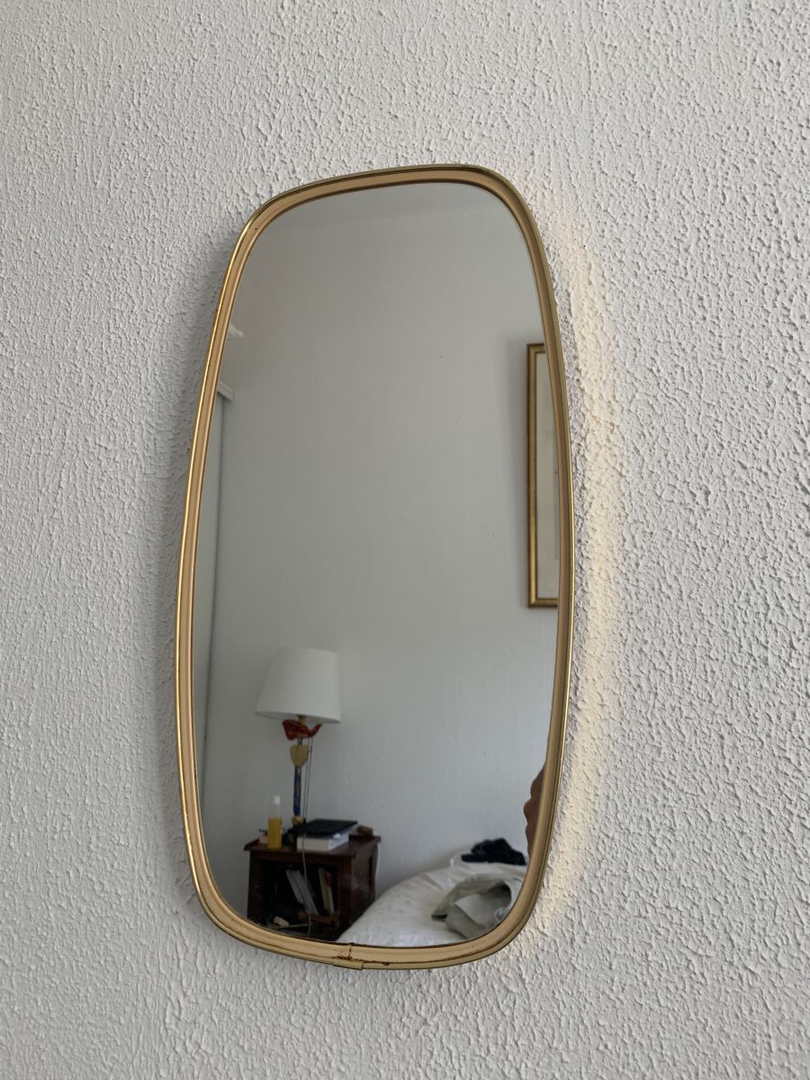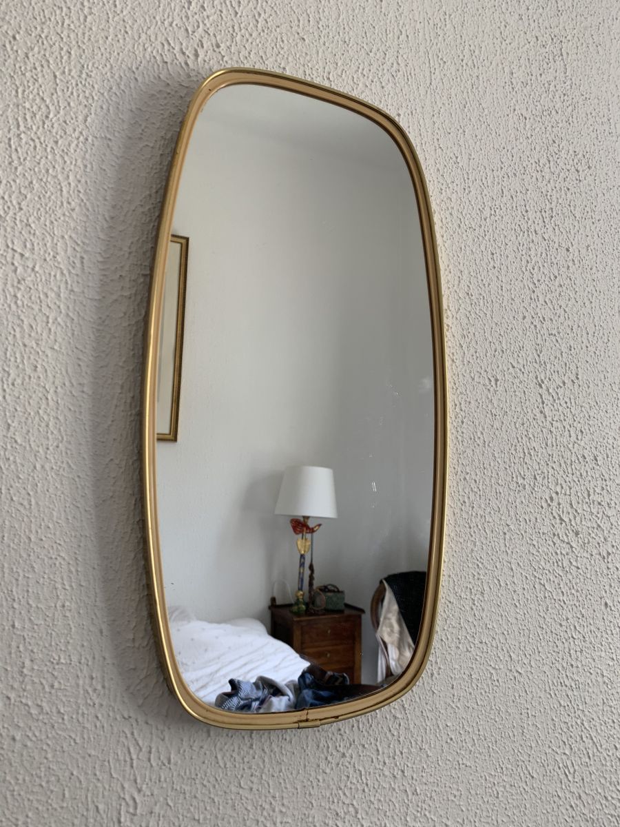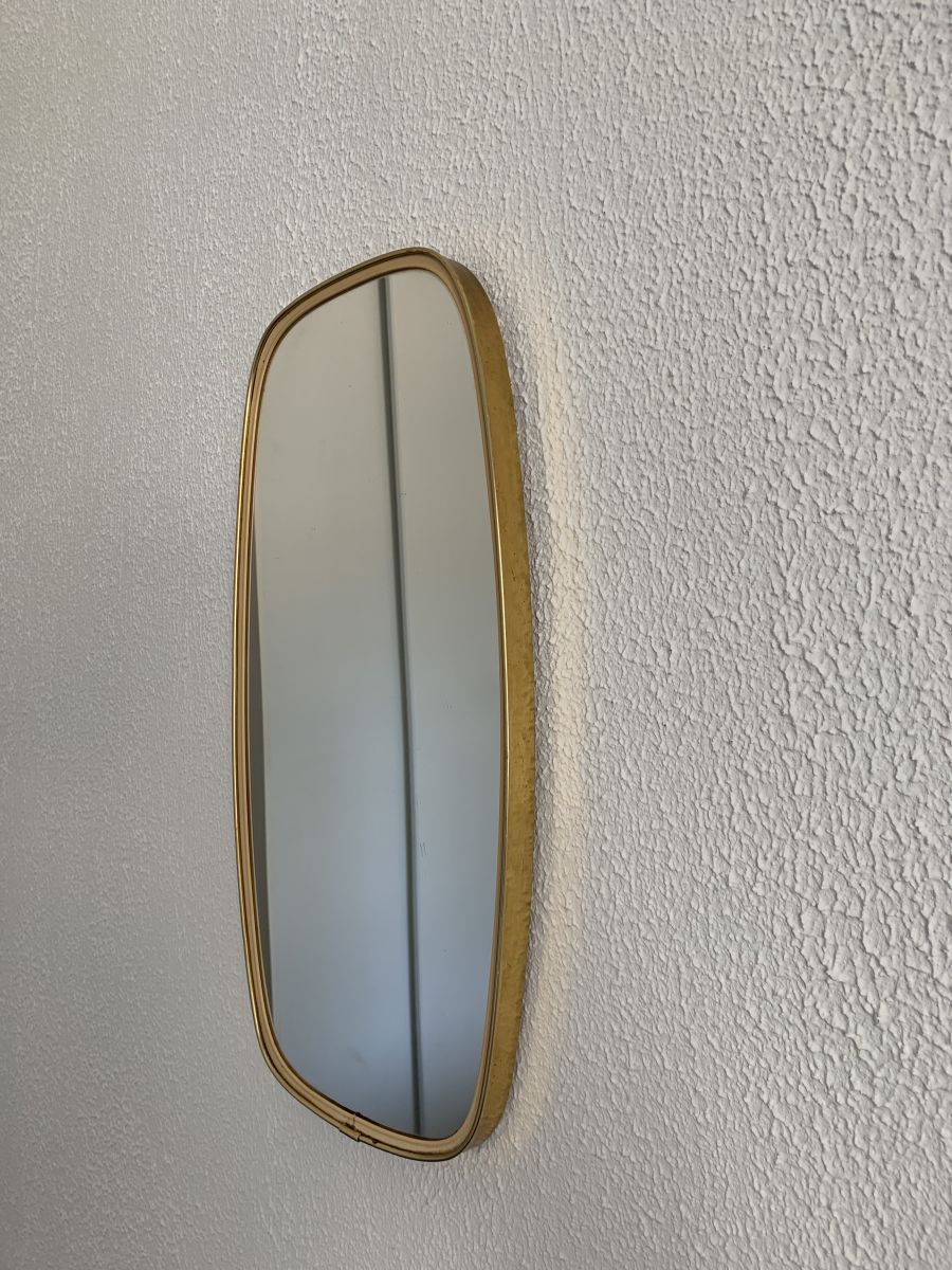 Ancien miroir rétroviseur asymétrique dit aussi forme libre dans le goût des miroirs de Gio Ponti en métal doré circa 1960 en bon état.