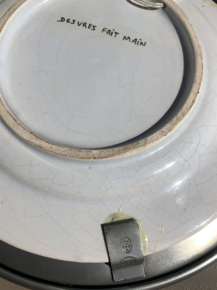assiette faïence Desvres et étain poinçonné, panier fleurs