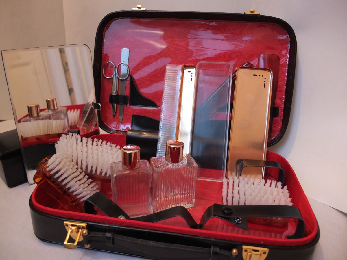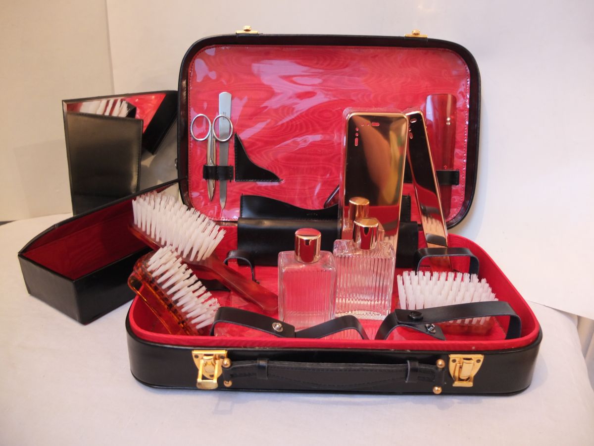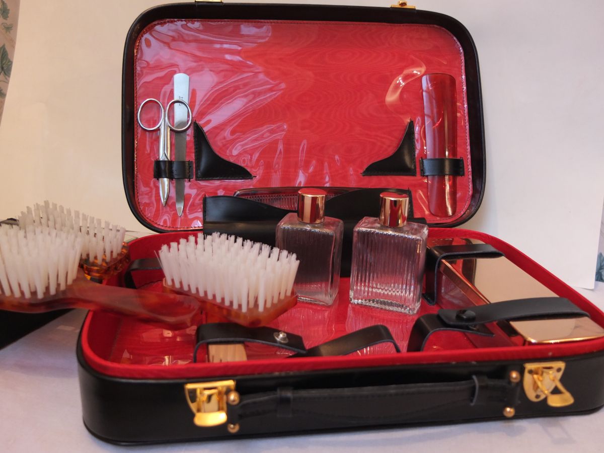 1 miroir (18X12) ; 2 flacons en verre (6x3 cm) ; 1 peigne ; 1 brosse , 1 brosse avec manche , 1 brosse à ongles ; 1 lime à ongles en métal ; 1 étui à brosse à dents avec aération ; 1 étui avec aération ; 1 coffret en cuir noir ; 1 paire de ciseaux ; 1 chausse-pied.