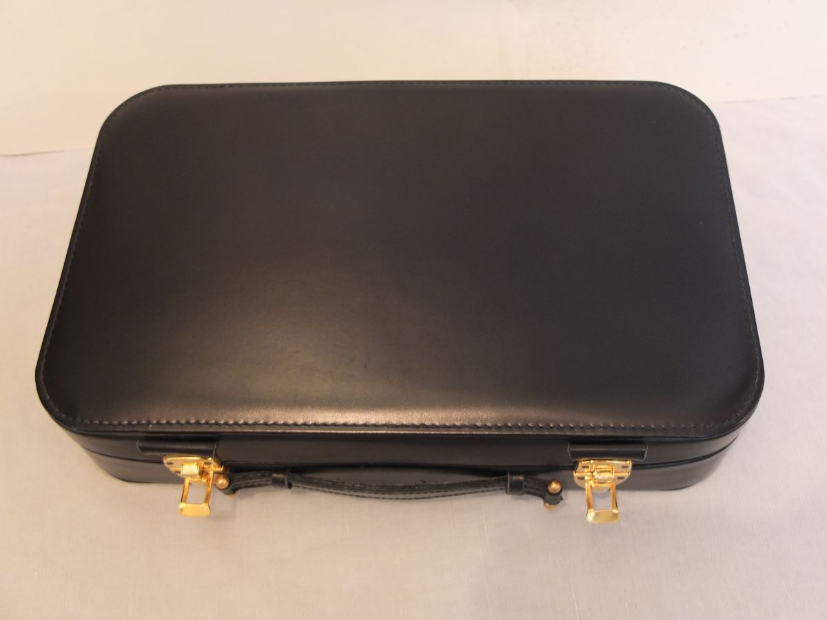 Nécessaire de toilette / valisette en cuir noir (30x19 cm - 6 cm de hauteur) avec une poignée et 2 fermoirs, l’intérieur est recouvert d’un tissu moiré rouge et recouvert d’une protection en plastique.