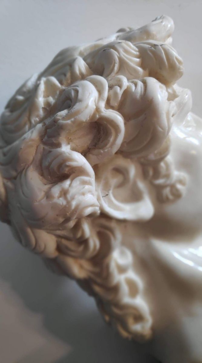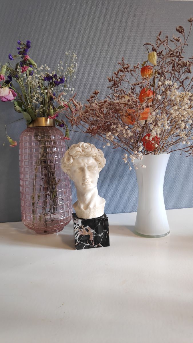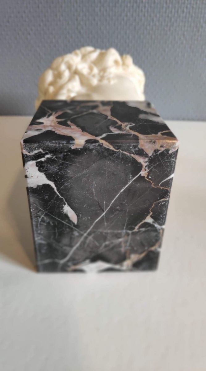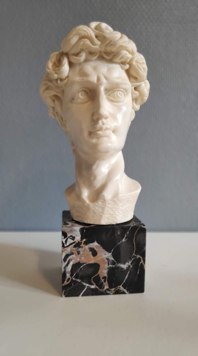 petit buste en composite blanc sur un socle en marbre veiné de rose