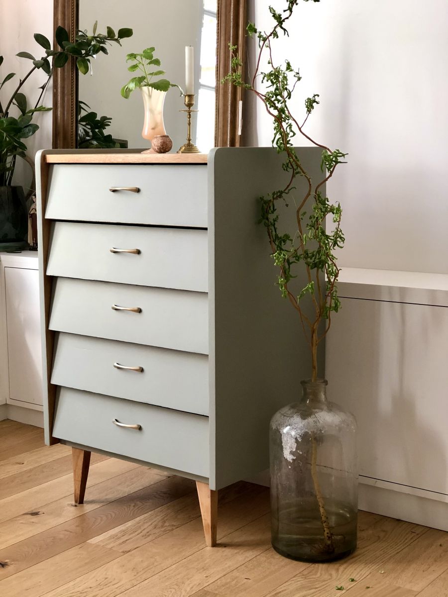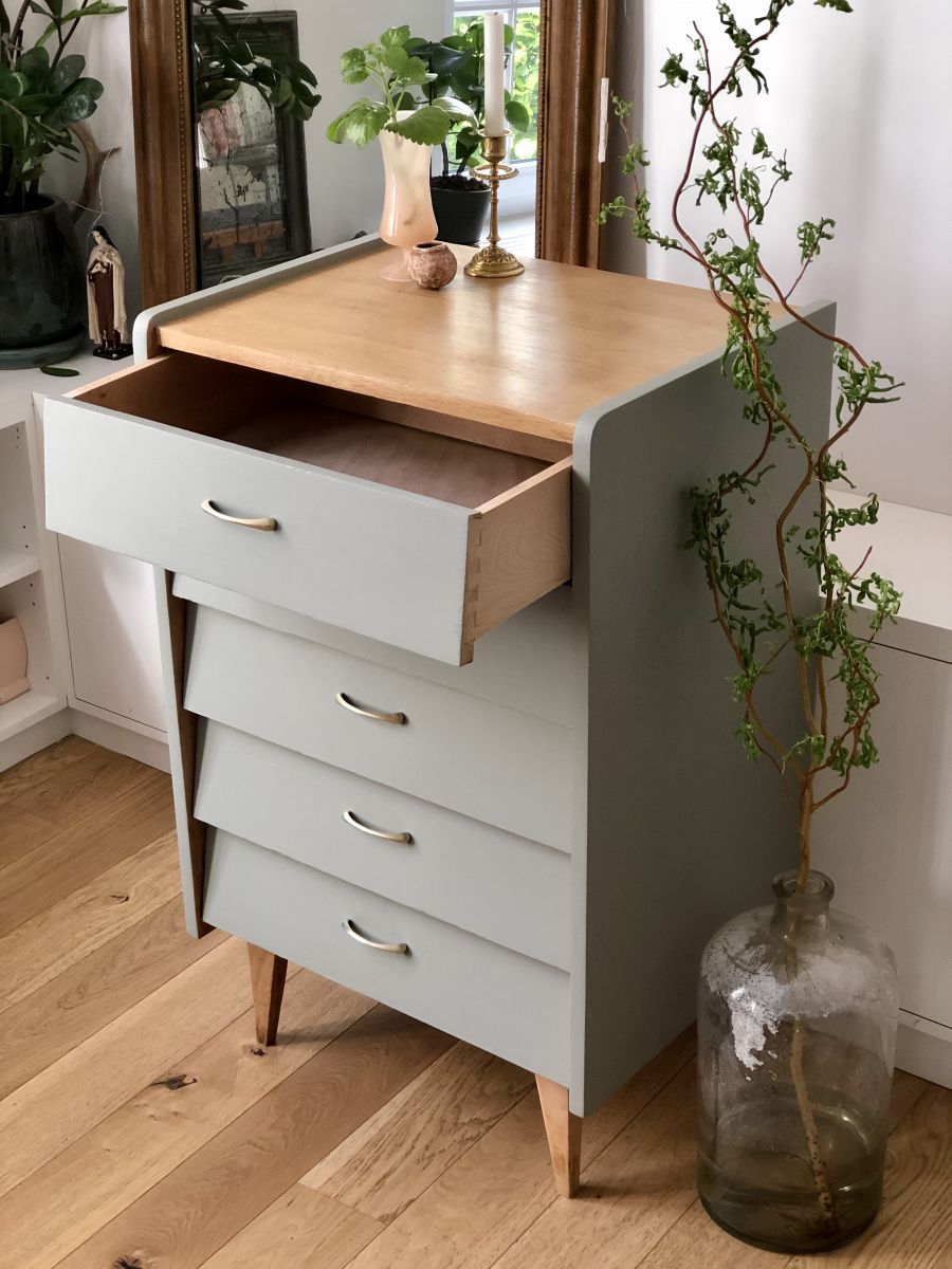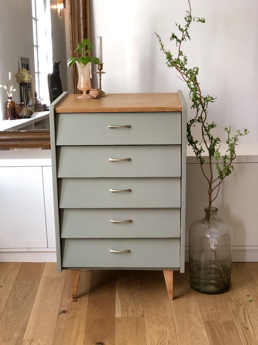 Charmante et élégante commode/ chiffonnier des années 50/60 avec de jolis pieds compas et ses tiroirs obliques.