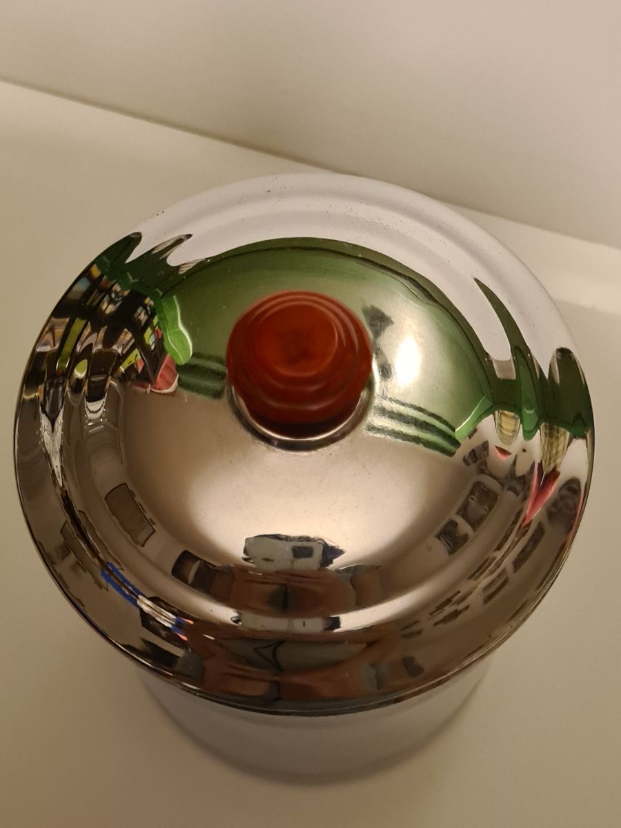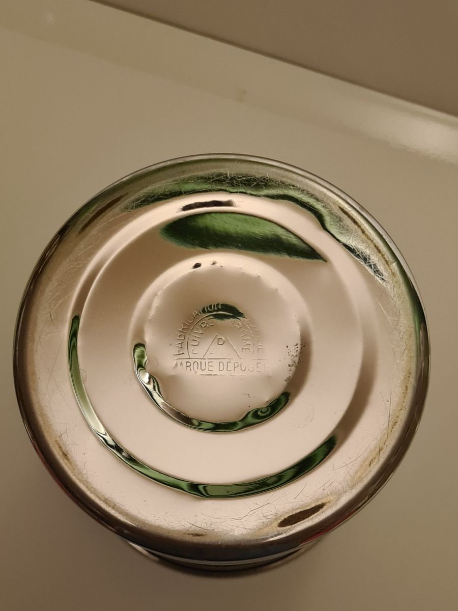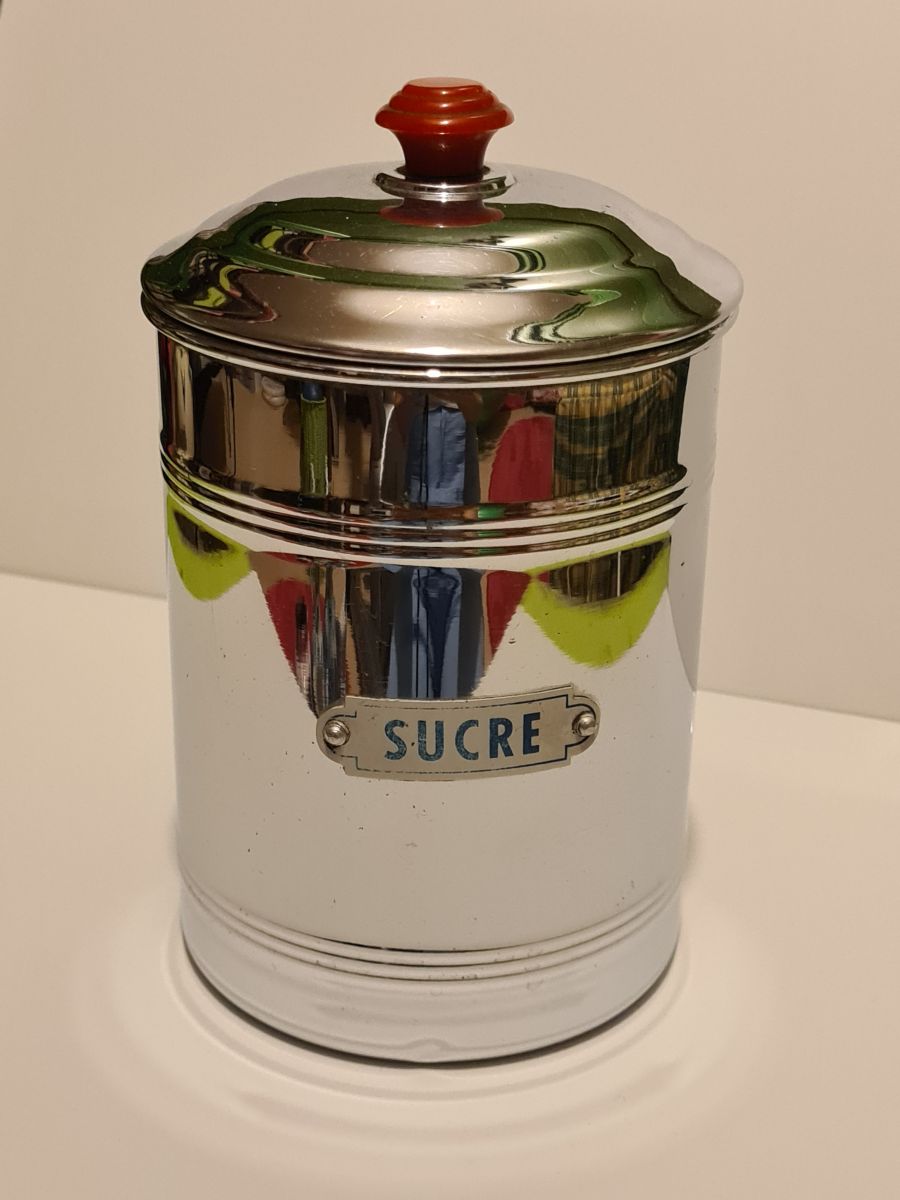Pot à sucre en cuivre chromé Vintage en bon état, quelques traces d'usage (voir photo). Dimensions : H. 17,5cm X L. 11,5cm X P. 11,5cm