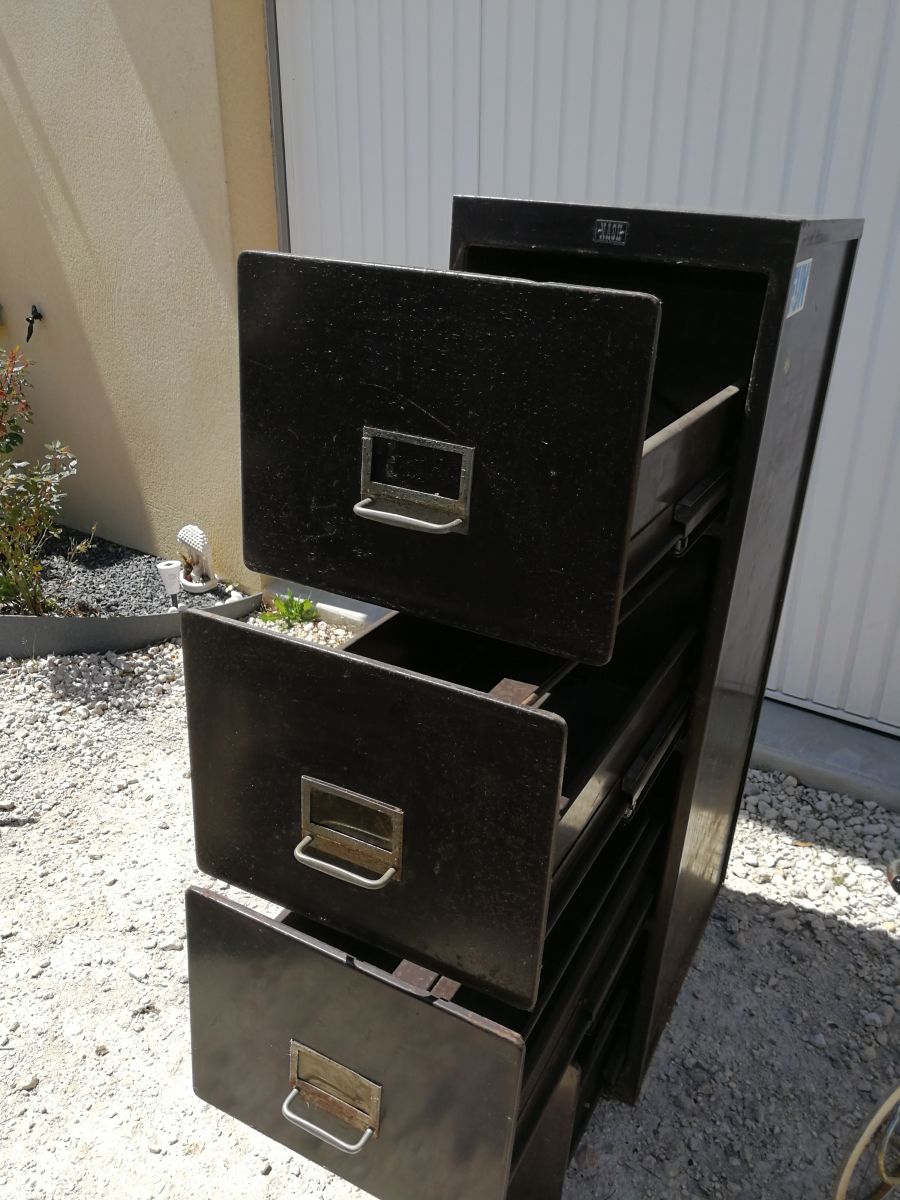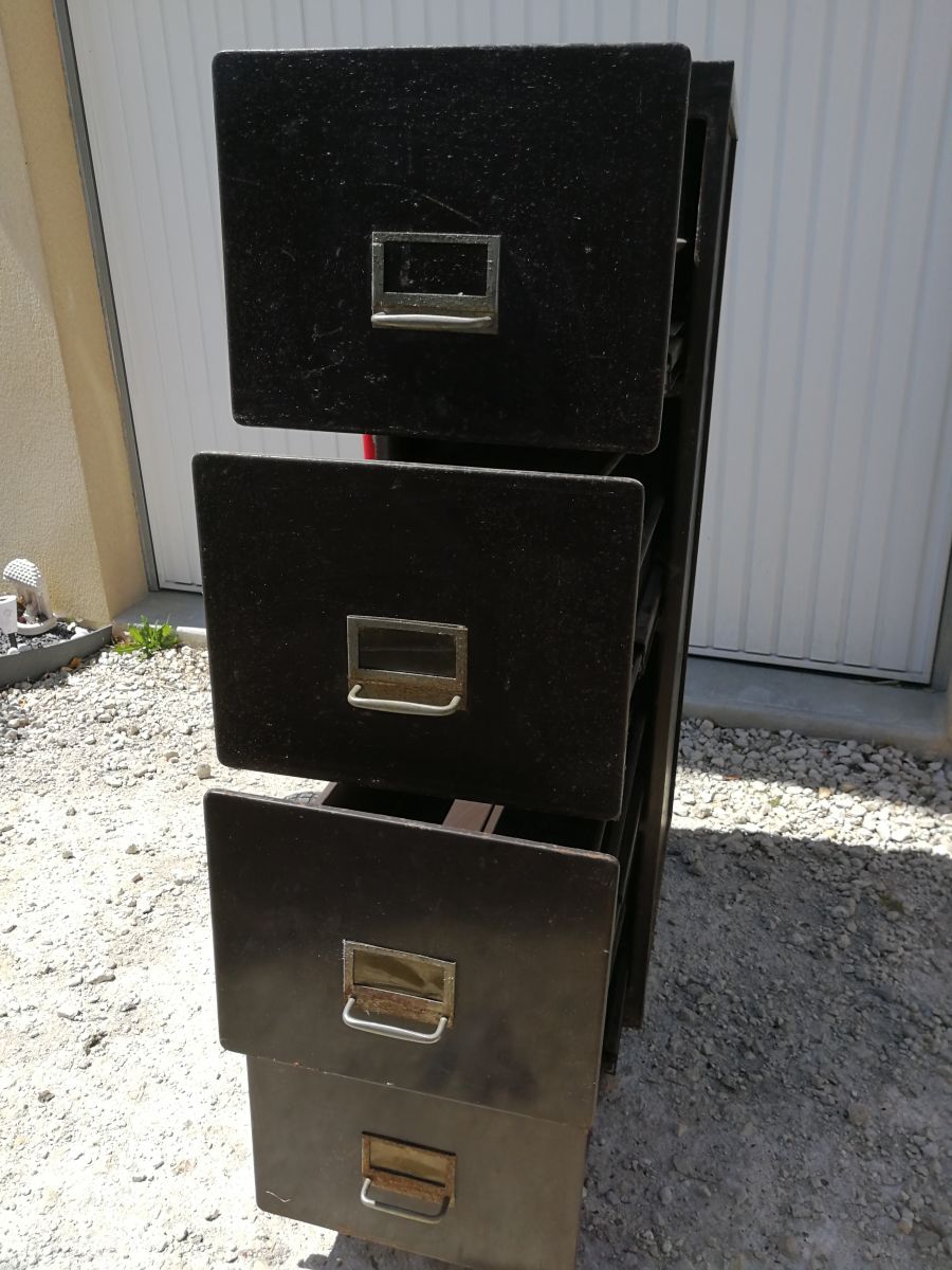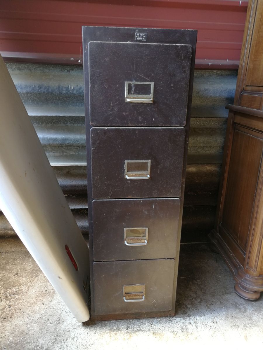 Casier 4 tiroirs industriel vintage de couleur marron avec sur les côtés quelques traces de rouille qui lui donne un style rétro.