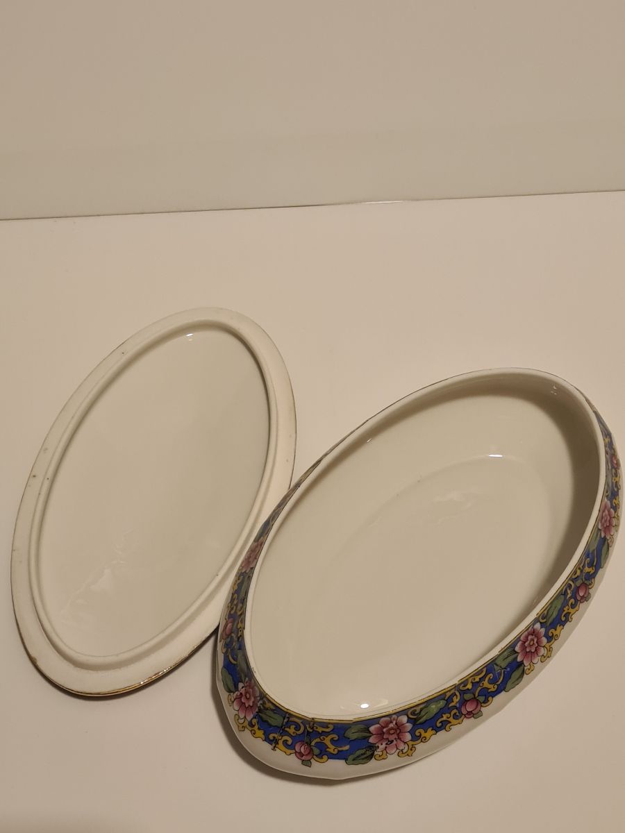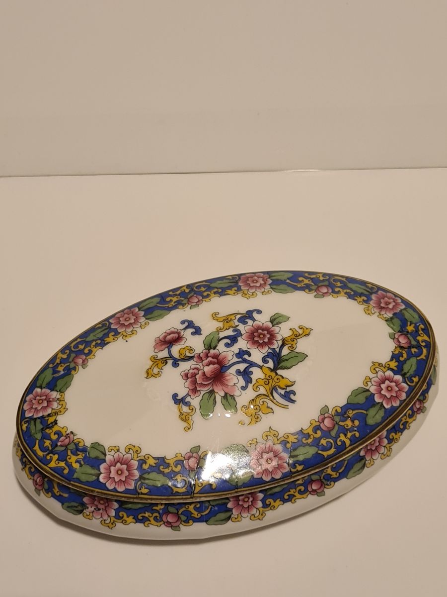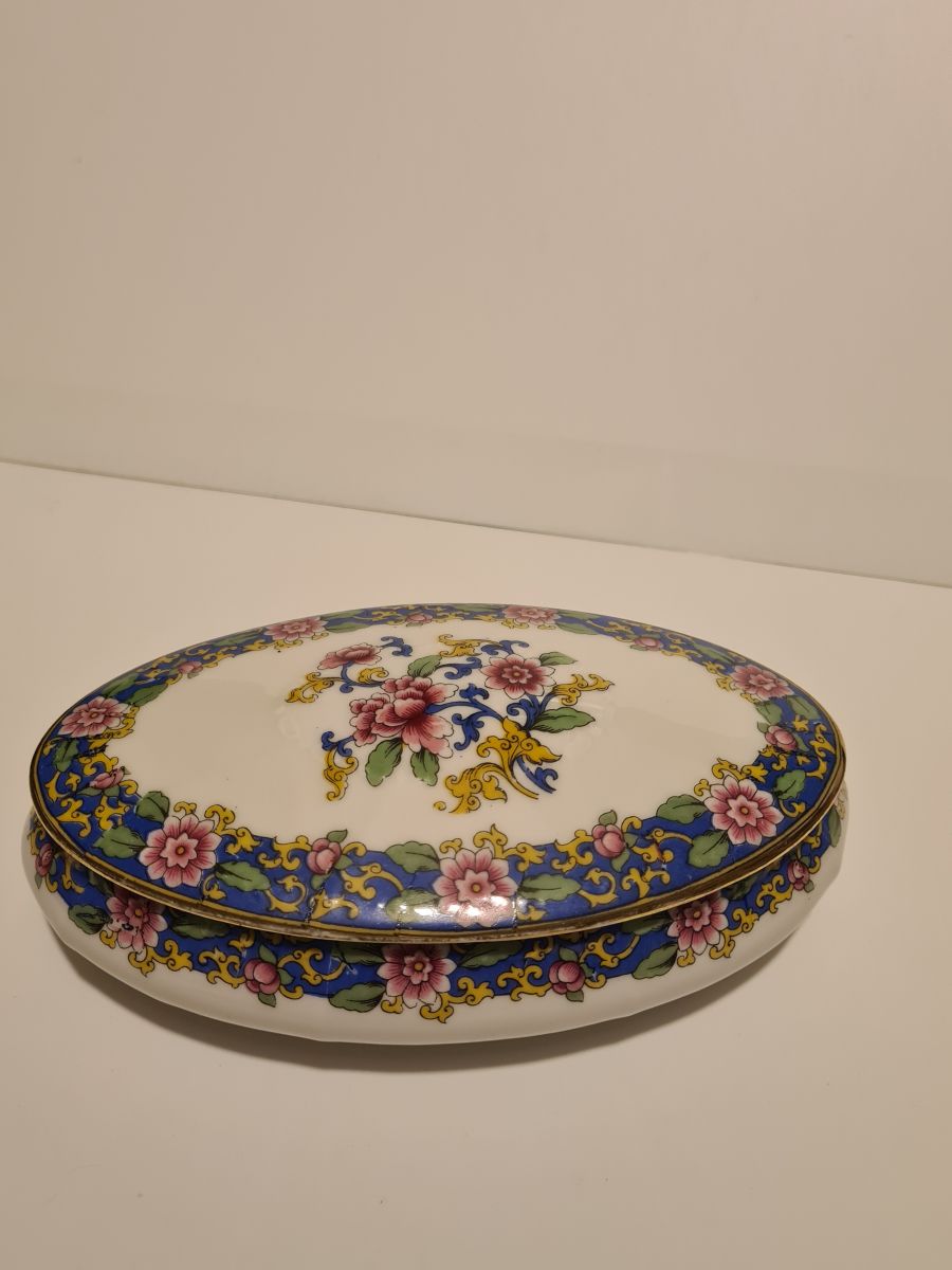 Bonbonnière Porcelaine de Limoges décor floral foisonnant, en excellent état, sans fêle Dimensions : H. 5cm X L. 17,5cm X P. 11cm