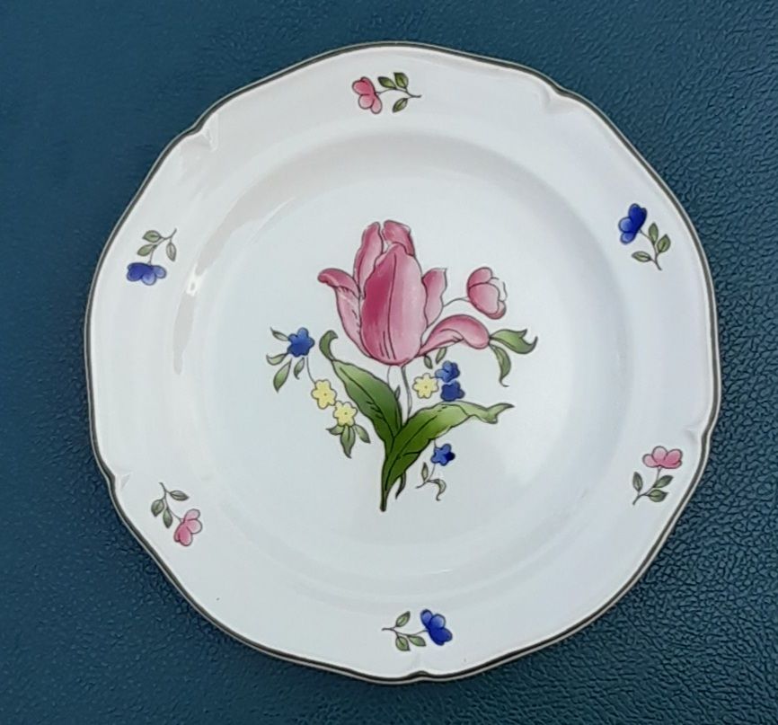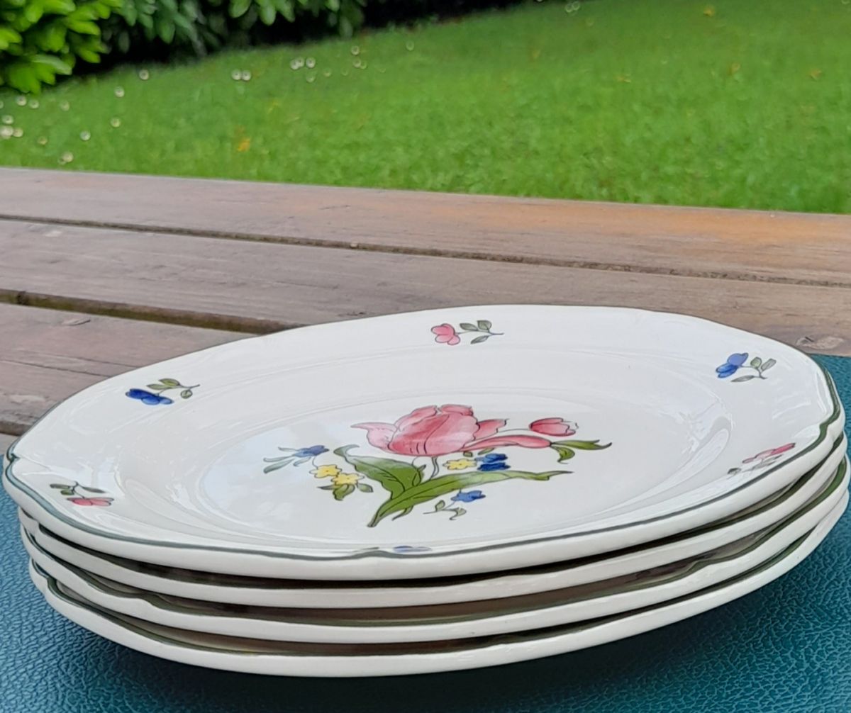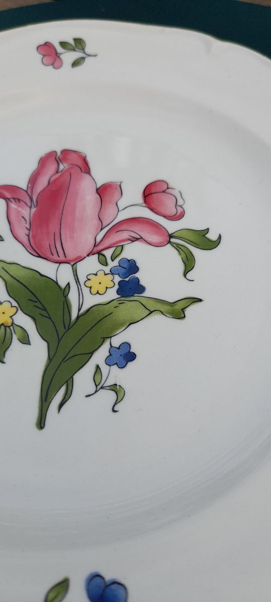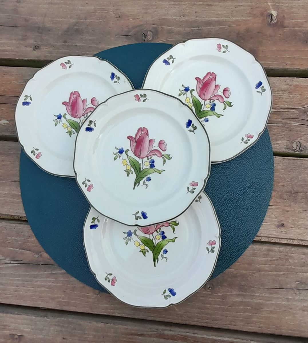 4 assiettes à dessert en porcelaine de gien, joliment décorées à la main, un travail tout en finesse. Motif tulipe, modèle lorraine, filet vert. Diamètre 18 cm. Elles sont en très bon état, Aucun fêle, aucun éclat ni égrenure.