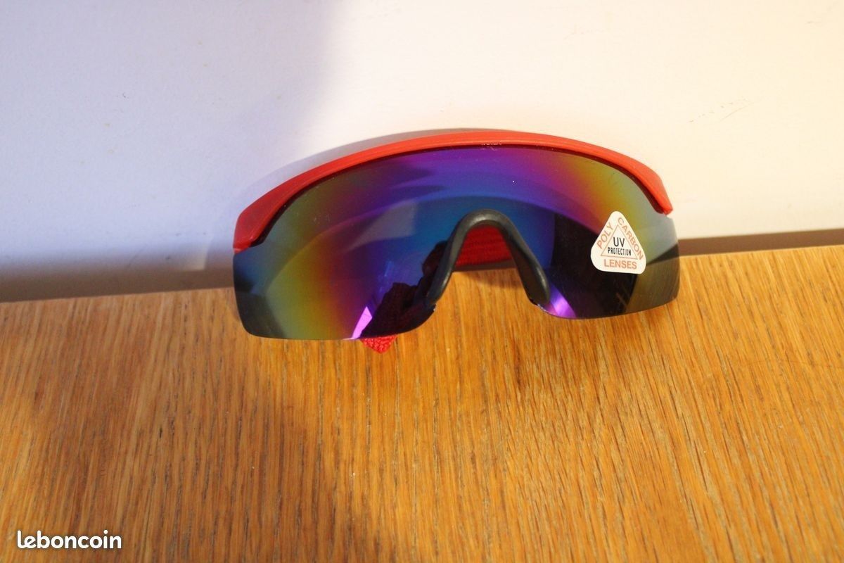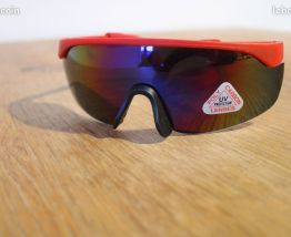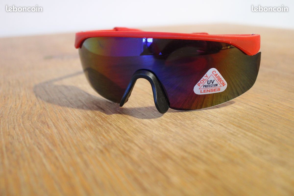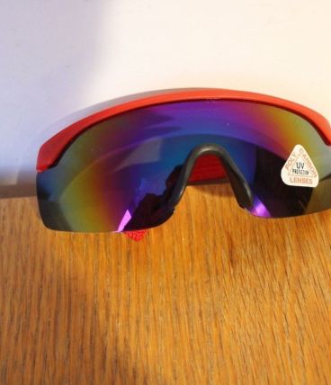 Autocollant d'origine sur un verre, portant la mention " Poly carbon lenses UV protection".