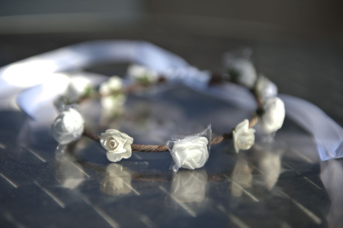 Couronne demoiselle d'honneur ou autre occasion de se faire belle. Convient à un tour de tête d'environ 45cm. Elle est composée de fleurs blanches à voilettes et sans. Fait main avec amour.
